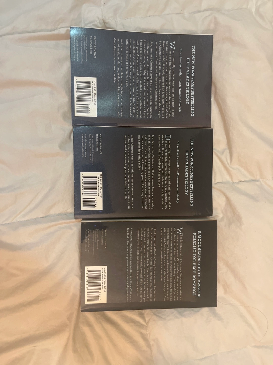Fifty Shades books Read a few times but like new no damage No more space on bookshelf. Trying to sell fast!! Cash preferred!! Selling the Fifty Shades Trilogy by E L James. This includes Fifty Shades of Grey, Fifty Shades Darker, and Fifty Shades Freed. A #1 New York Times Bestseller and a Goodreads Choice Awards Finalist for Best Romance, this series is sure to captivate!