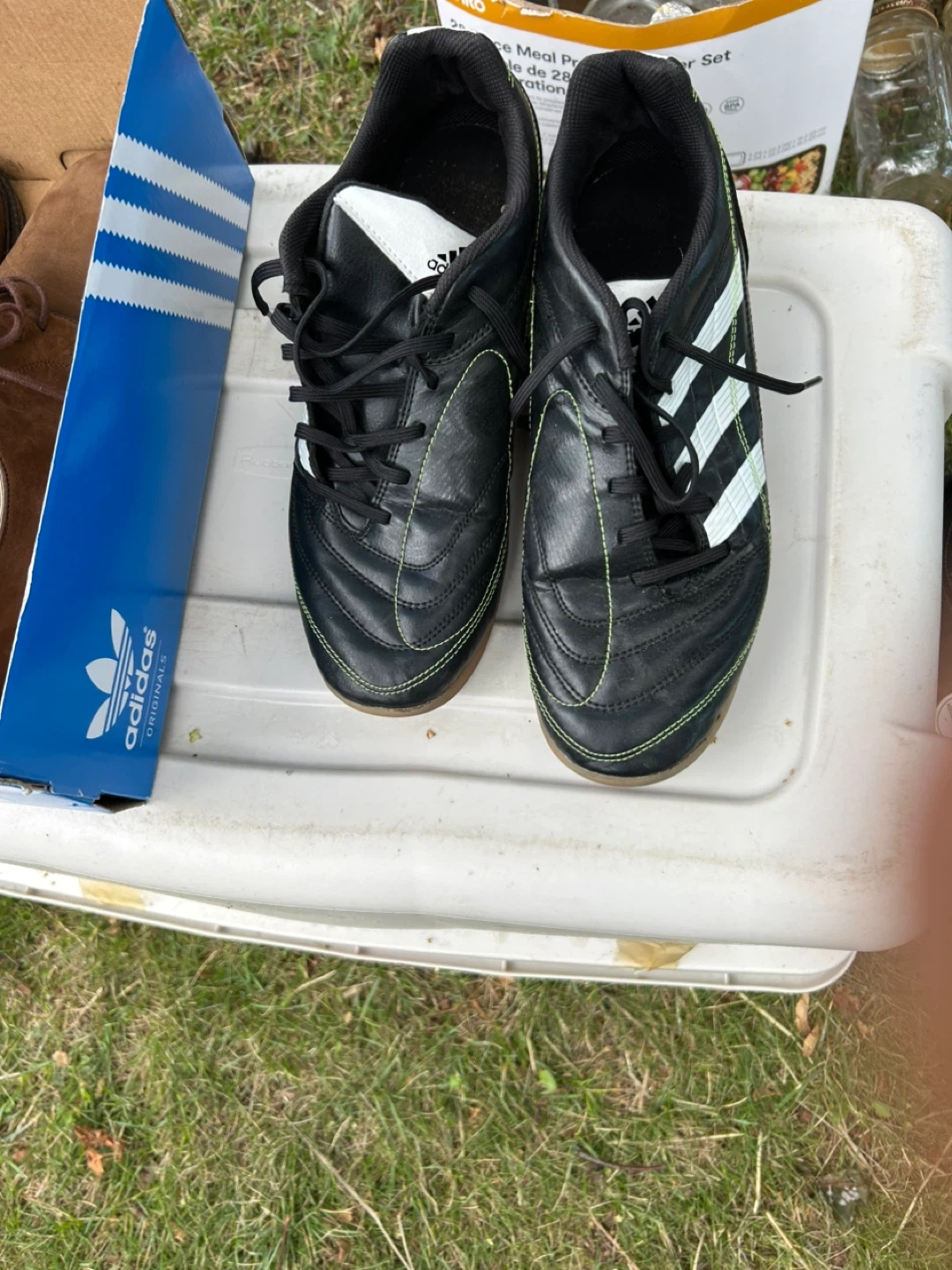 Selling a pair of Adidas soccer cleats in black. They are in good condition and ready for the field! The classic Adidas design with the three stripes is always a winner