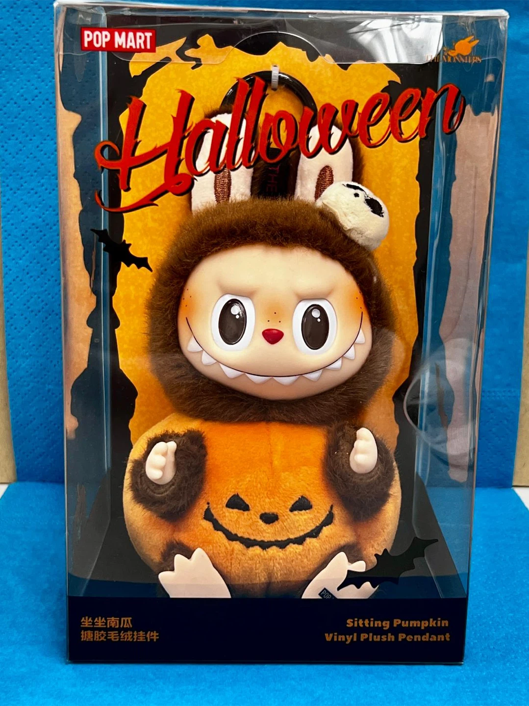 Selling a Pop Mart Halloween vinyl plush pendant featuring a cute character sitting on a pumpkin! It's in excellent condition and comes in its original box. This adorable collectible is perfect for Halloween or any time of year