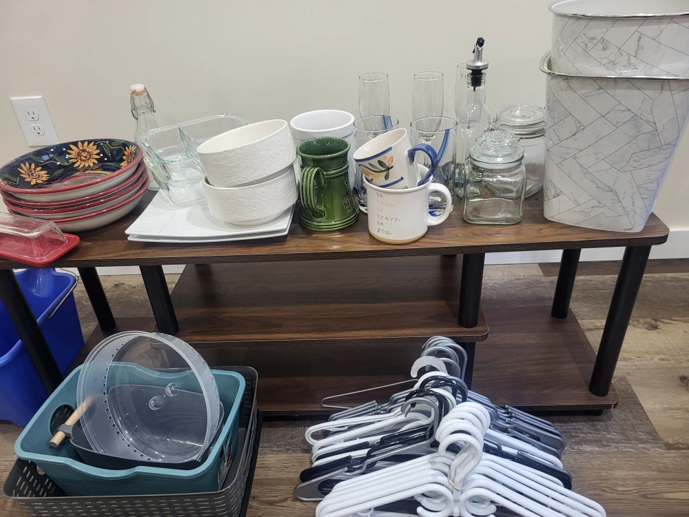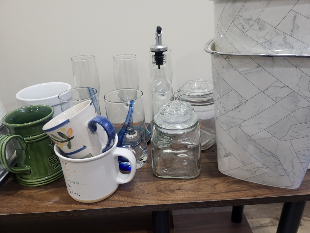 Selling a collection of various kitchenware items. There are mugs, glasses, bowls, containers, and other items. Perfect for stocking up your kitchen!