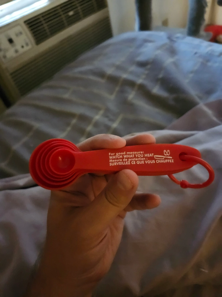 Here's a set of red measuring spoons, perfect for baking or cooking! The text on the side says 'For good measure: WATCH WHAT YOU HEAT' and 'Mesure de protection: SURVEILLEZ CE QUE VOUS CHAUFFEZ'
