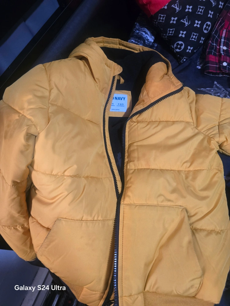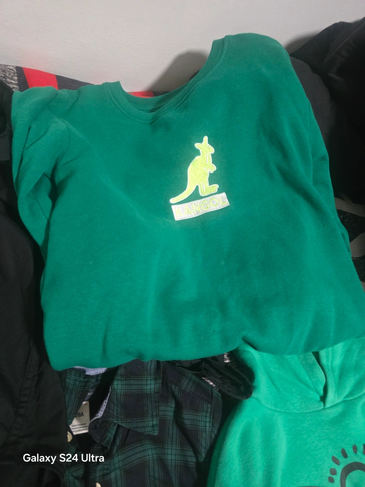 Selling a mixed lot of clothing items. Includes a green Kangol sweatshirt, an Old Navy puffer jacket, and a Chaps plaid shirt. All items are in good used condition!
