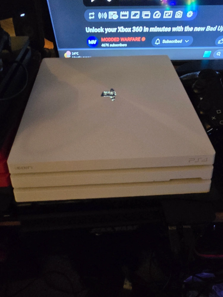 Ps4 pro white 1TB NO CONTROLLER with latest Blu-ray disc jailbreak.Has about 18 games and YouTube and Netflix. Custom theme and avatar also