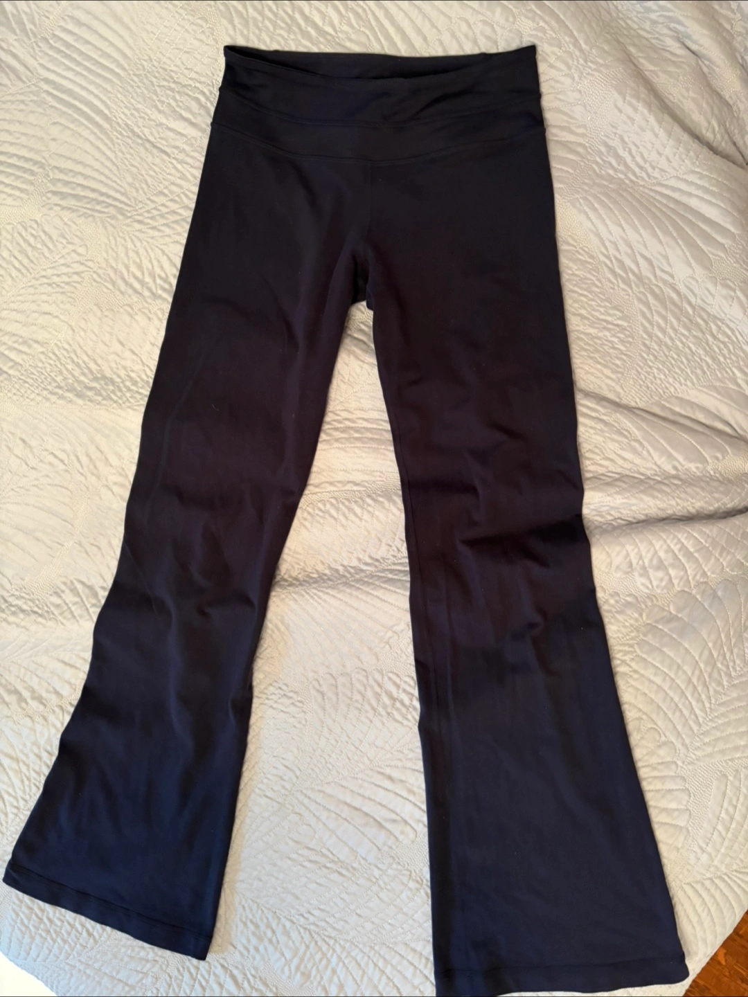 Selling a pair of Lululemon Groove pants in a size 6. They're a flared style, lovely navy colour and in great condition. Perfect for yoga or just lounging around! I also offer a matching yoga top