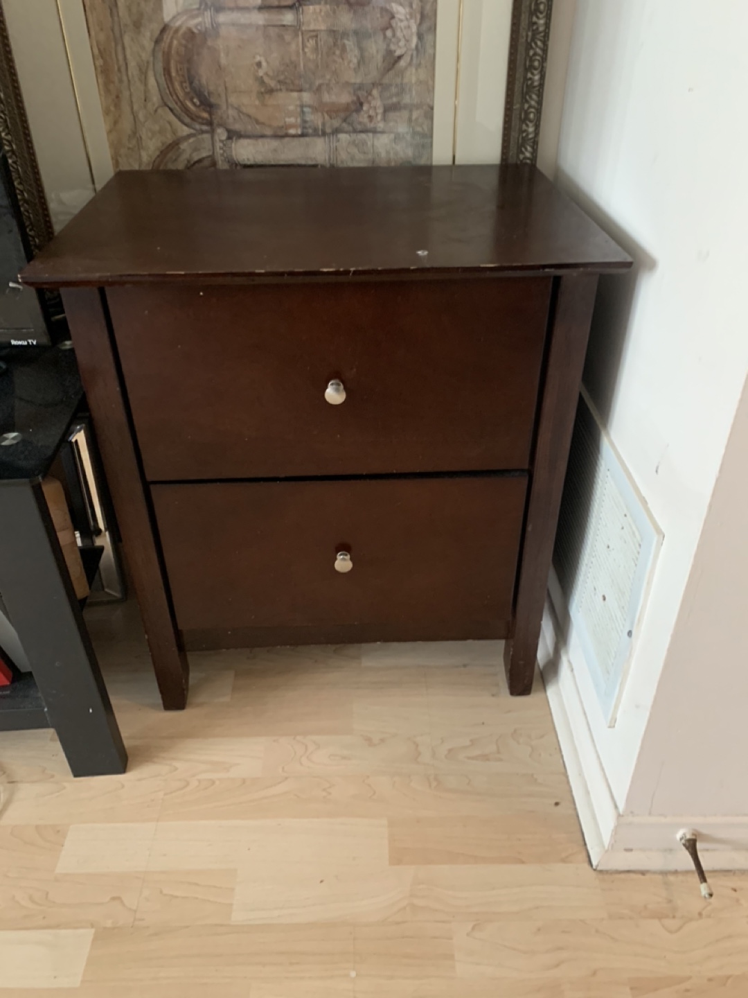A lovely brown wood nightstand with two drawers. It's perfect for storing your bedside essentials and adding a touch of warmth to your bedroom. It has some wear on top.
