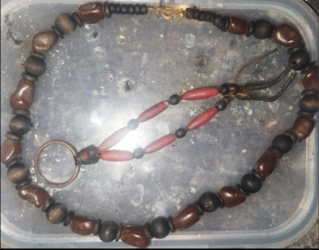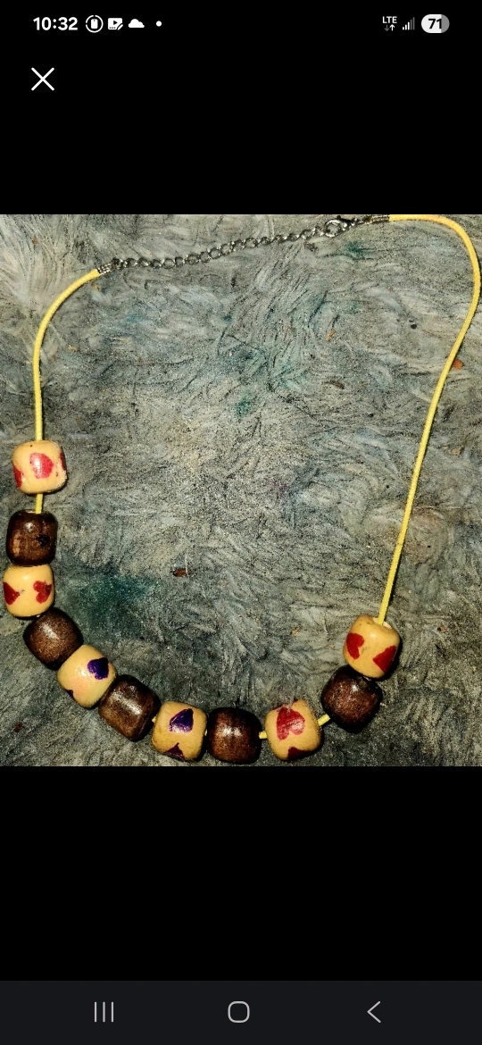 Here's a cute blue beaded bracelet! It features a fun pink star charm. Perfect for adding a pop of colour to any outfit. +Pink Beaded Bracelet. + metal bracelet with rhinestones . +This is a handmade beaded necklace with colourful beads. It's a fun and unique accessory to add to your collection! + Handmade Wooden Bead Necklace. Check out this unique handmade necklace! It features a mix of wooden beads in brown and light brown, some with cute heart and purple designs. The necklace has a yellow cord and a silver-tone chain for adjustable length. A fun and stylish accessory! +Selling a unique beaded necklace! It features a mix of brown, black, and red beads, and a cool ring pendant. The necklace has a handcrafted, earthy vibe, perfect for adding a touch of bohemian style to any outfit. Pick up only.