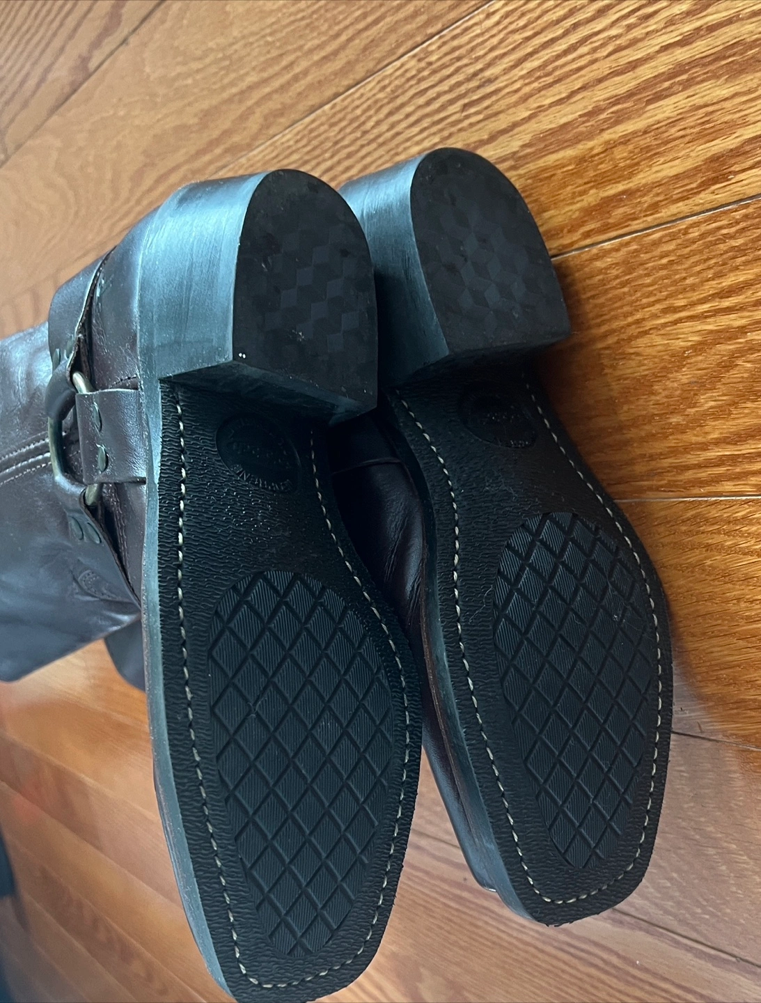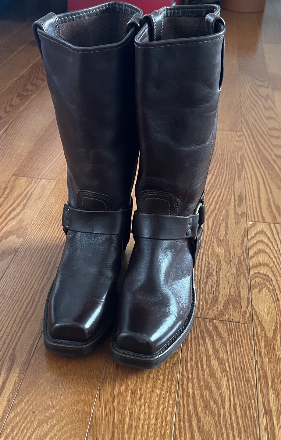 Selling a pair of Frye harness boots in a dark brown leather. These boots have a classic look and are very durable. They show some signs of wear but are still in good condition and have lots of life left in them!