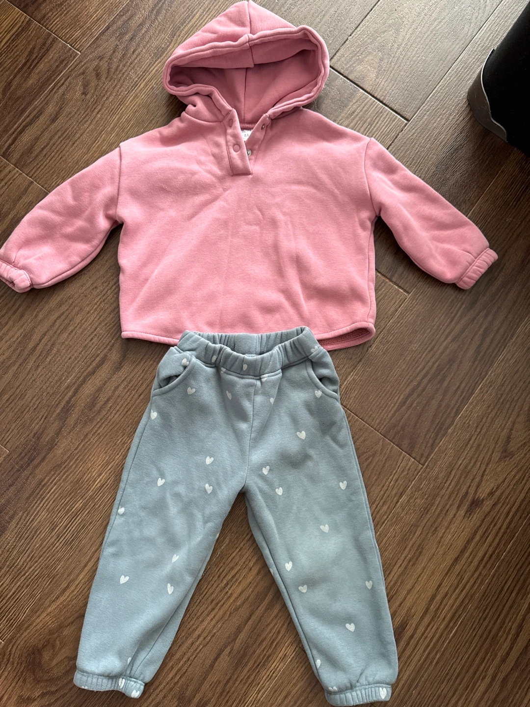 A cute Zara Kids set for your little one! This set includes a pink hoodie and light blue pants with a heart pattern. The size is 2-3 years (CM 98). Perfect for keeping your child comfy and stylish!