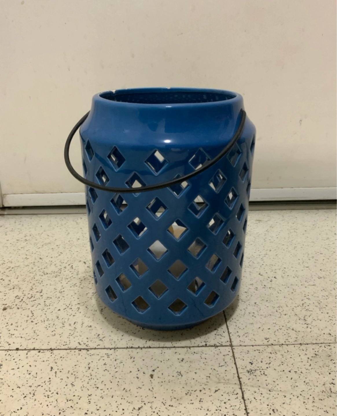 This is a lovely blue decorative lantern. It features a unique diamond-shaped cutout design and a convenient handle for easy carrying or hanging. Currently has an LED candle but can be used with a real candle as well