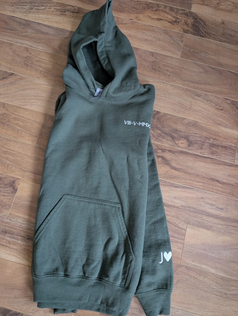 Cozy olive green Gildan hoodie . It features a front pocket and a hood. The hoodie has some custom embroidery on the chest and sleeve. Perfect for staying warm on cool days!