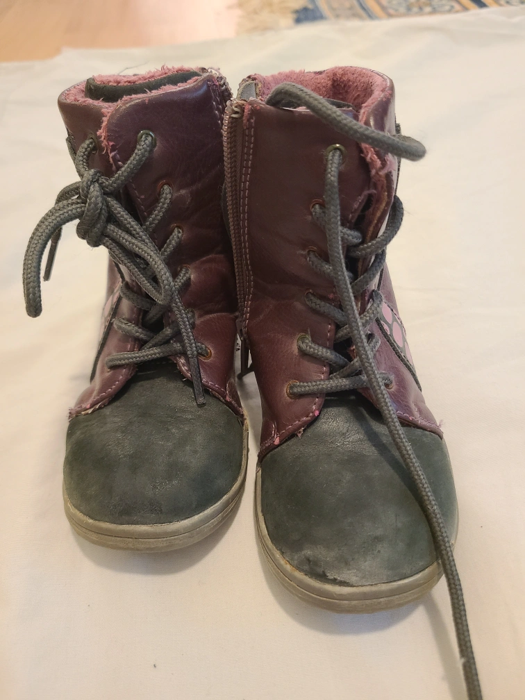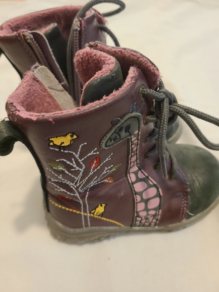 These adorable kids' boots feature a fun giraffe and tree design! They're made of leather and have a cozy, soft lining. The boots have both laces and a zipper for easy on and off. Perfect for keeping little feet warm and stylish!