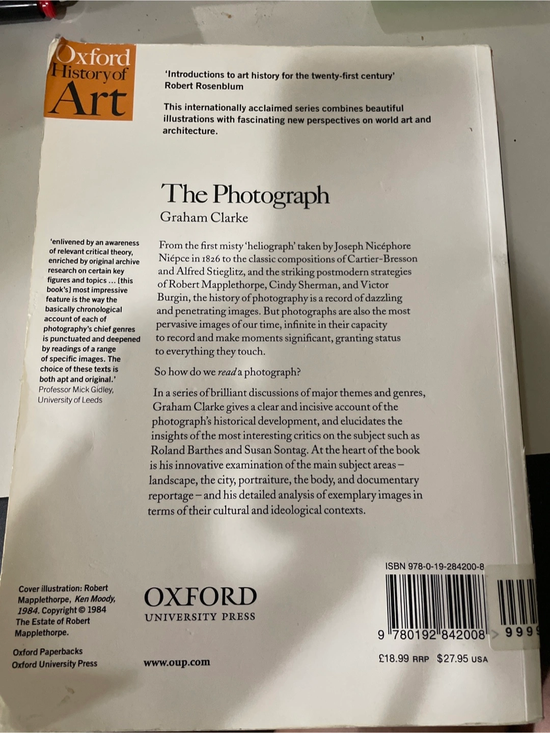 Selling "The Photograph" by Graham Clarke, part of the Oxford History of Art series. This book combines beautiful illustrations with fascinating new perspectives on world art and architecture. It delves into the history of photography, discussing major themes and genres, and elucidates the insights of historical development