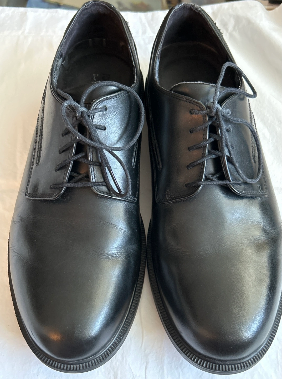 Selling a pair of Dunham waterproof black leather dress shoes. They're in good condition and ready for a new home. Some leather peeling off the back of the shoes. Please check the pictures provided.