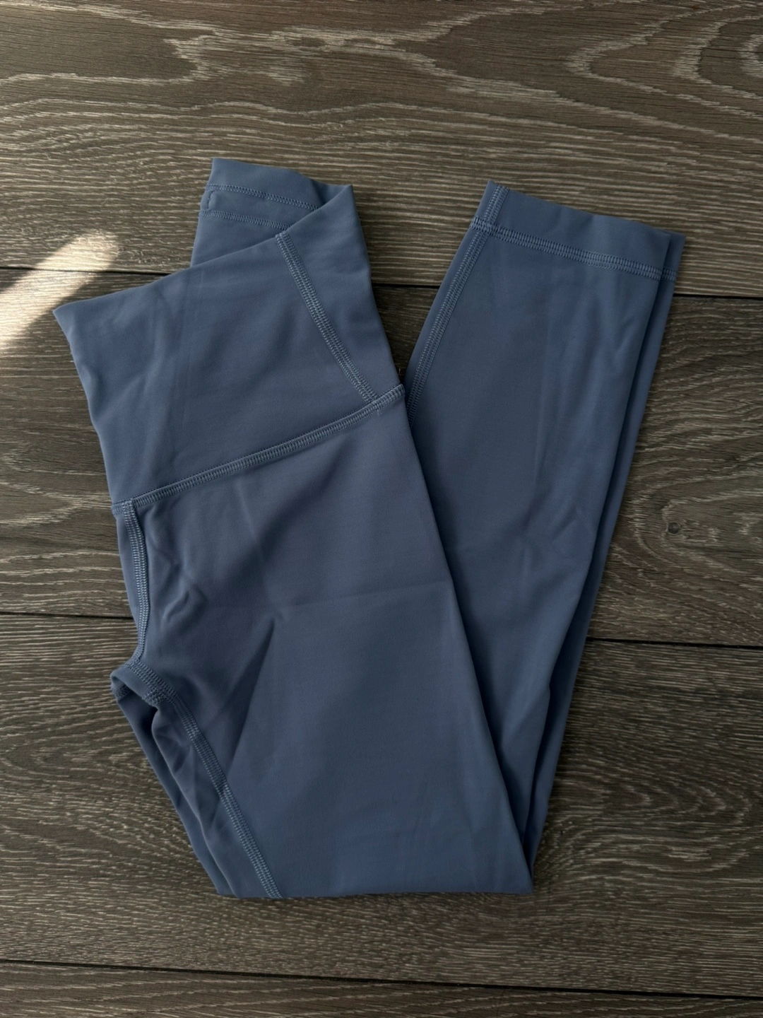 Selling a pair of Lululemon Wunder Train High-Rise Crop 23" leggings in size 2. The colour is Blue Twill. Originally $108 Material: - 77% nylon - 23% lycra elastane - Pocket lining: 56% Coolmax polyester, 33% nylon, 11% lycra elastane Pick up only - downtown toronto Cash only