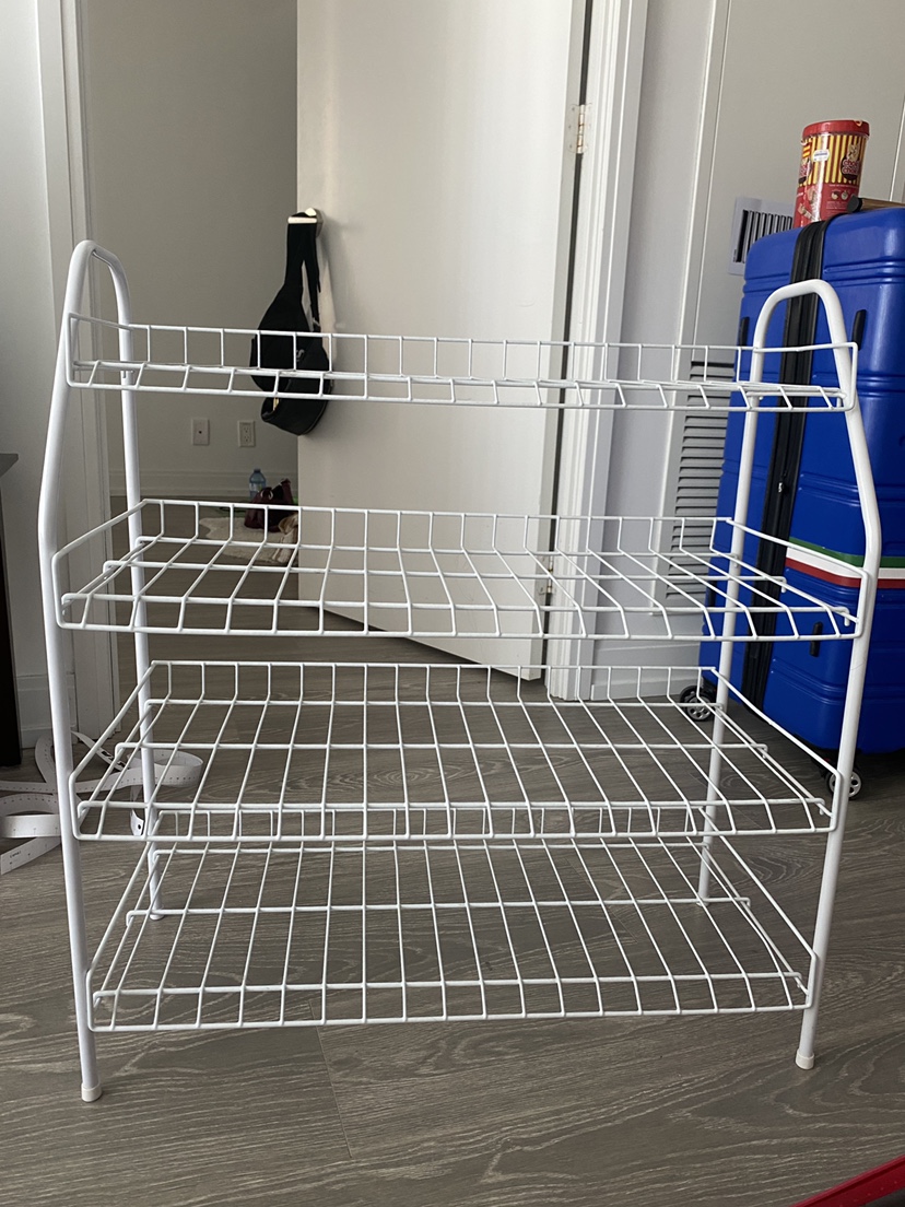 Handy white wire shelf with four tiers! It's great for organizing shoes, pantry items, or anything else you need to keep tidy. It's in good condition and ready for a new home