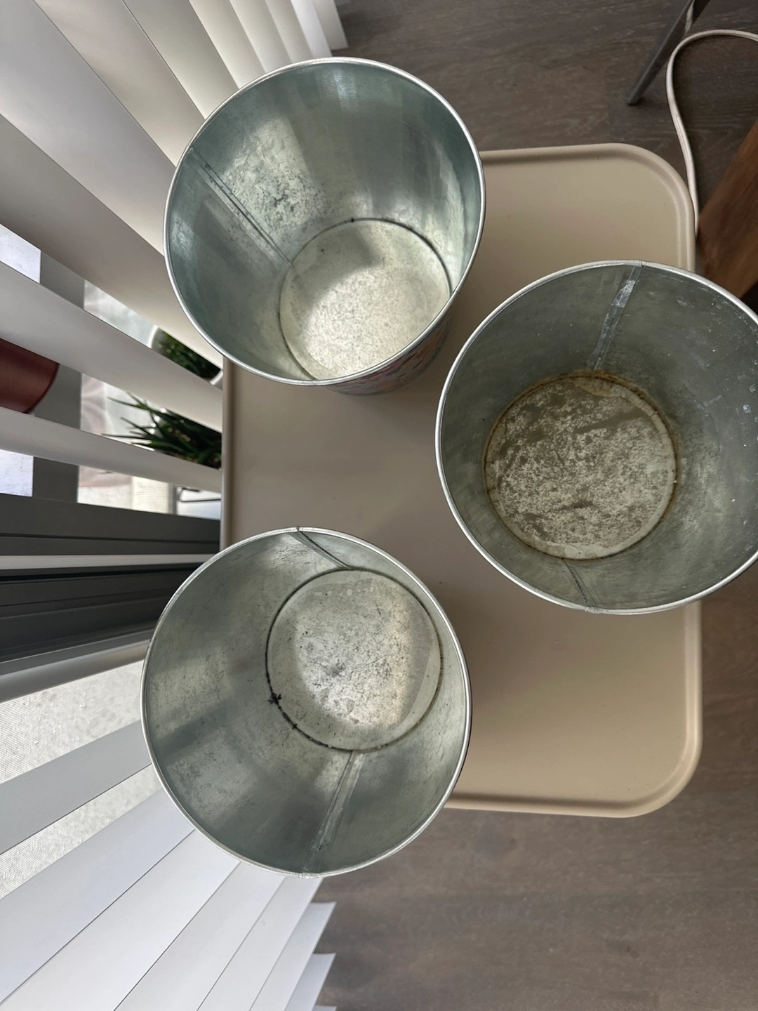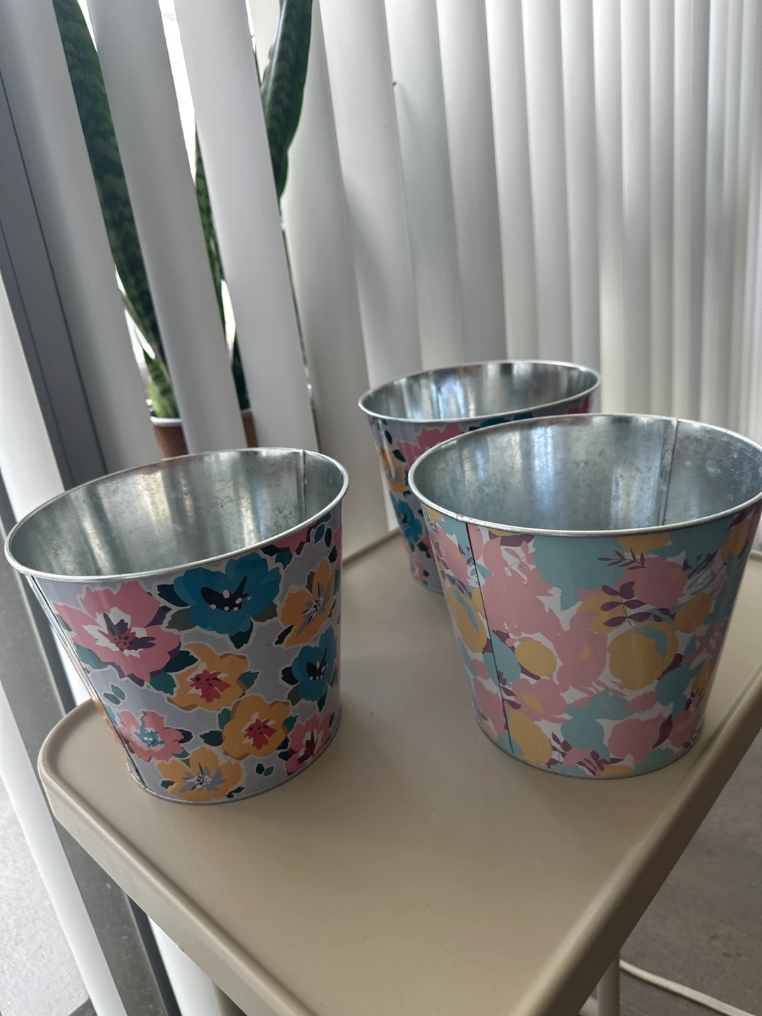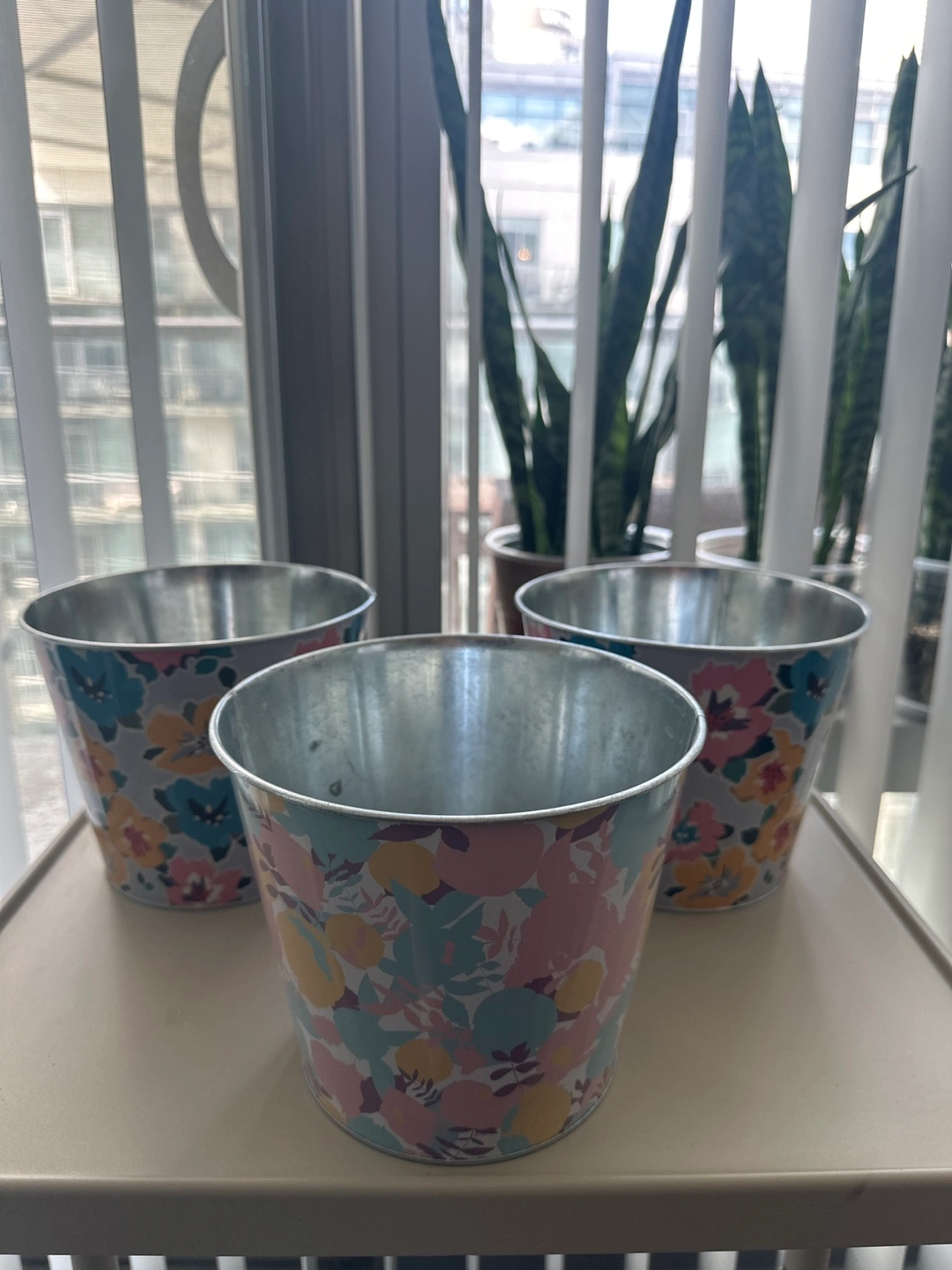 Here's a set of three metal flower pots with a cute floral pattern! They're perfect for adding a touch of colour to your home or balcony. They are in used condition and have some minor wear.