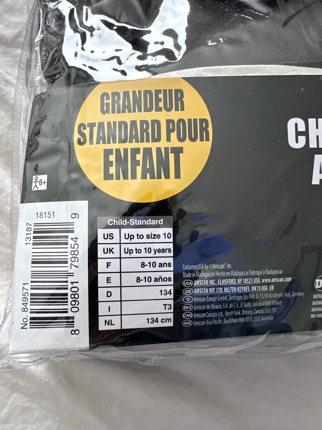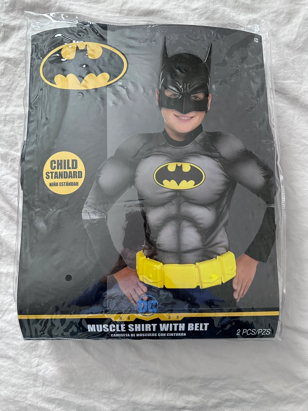Selling a brand new unopened Batman muscle shirt with belt only costume for kids! It's a child standard size, suitable for ages 8-10 years or up to size 10 (US sizing). Perfect for Halloween or dress-up!