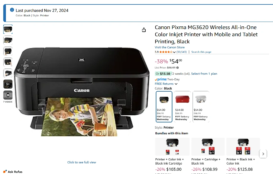 Selling a Canon Pixma MG3620 wireless all-in-one color inkjet printer! It's perfect for mobile and tablet printing. The printer is black and in great condition. Comes with a power cord and driver CD