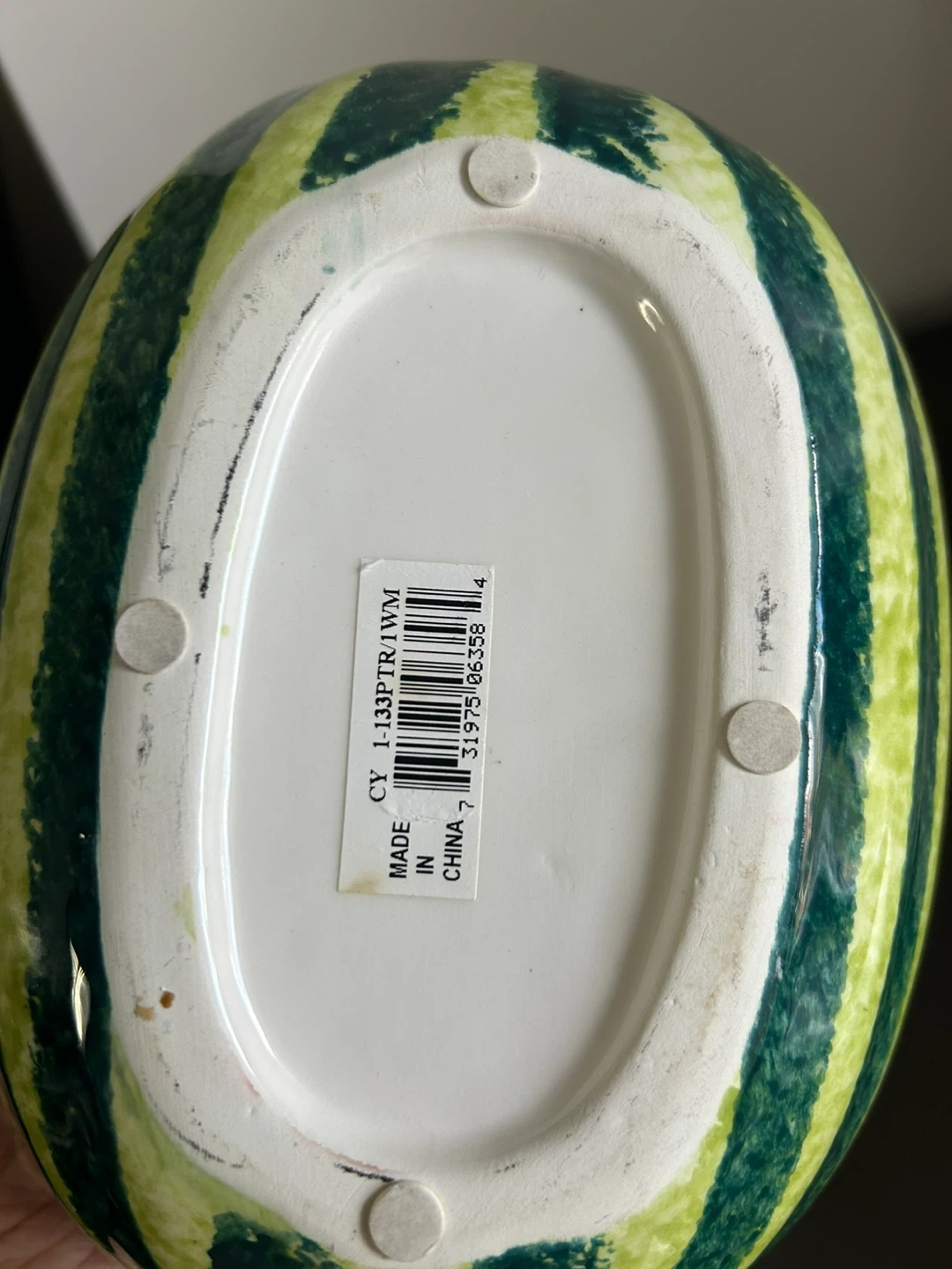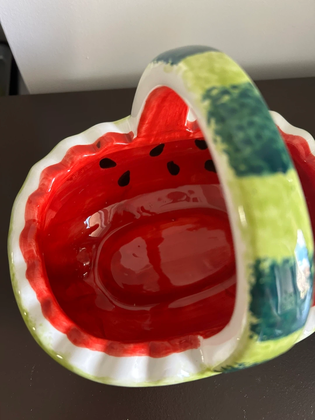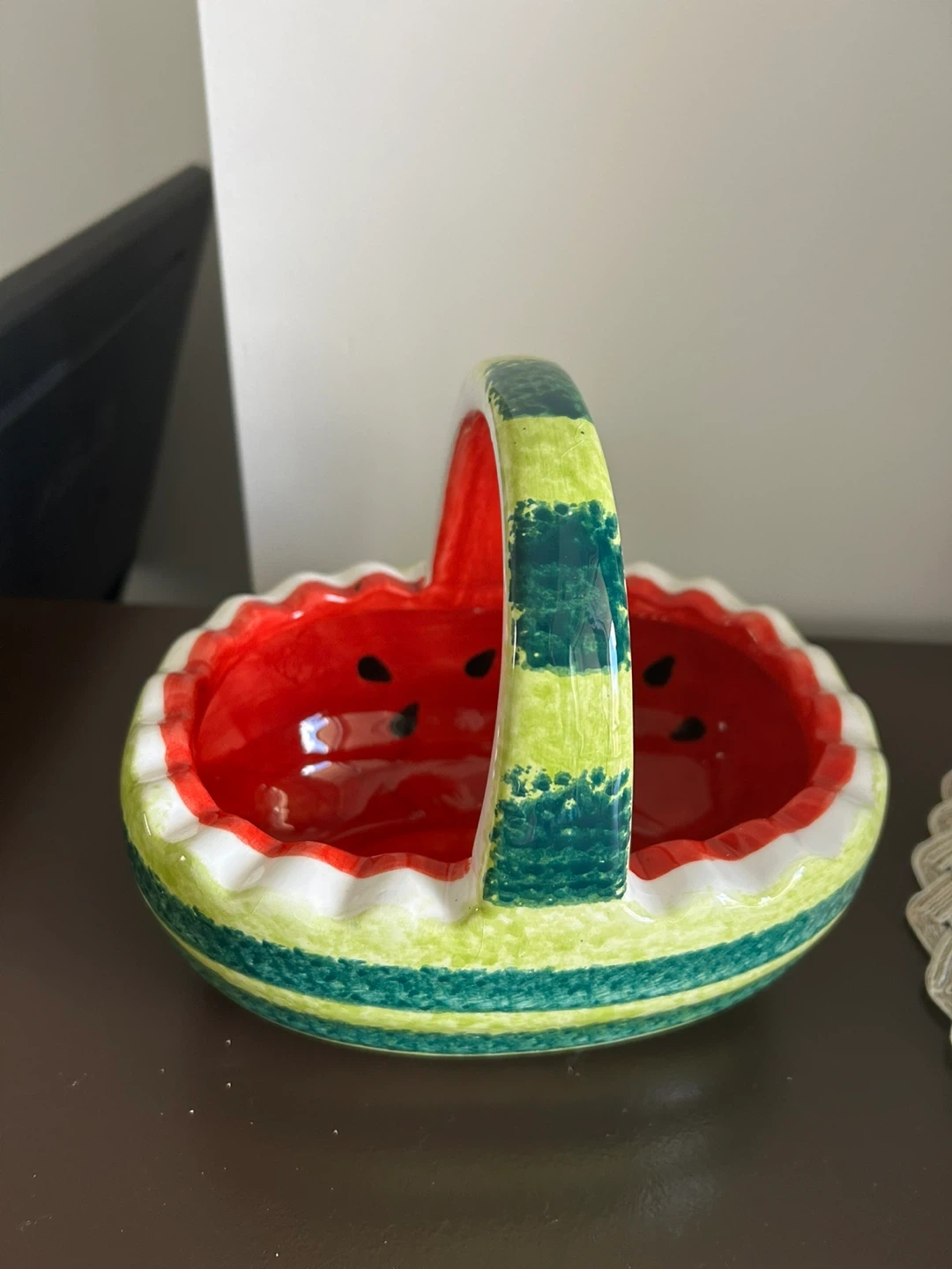This is a cute watermelon-themed ceramic basket! It's perfect for adding a bit of fun to your kitchen or as a decorative piece in any room. The colours are vibrant and cheerful, making it a great addition to any home