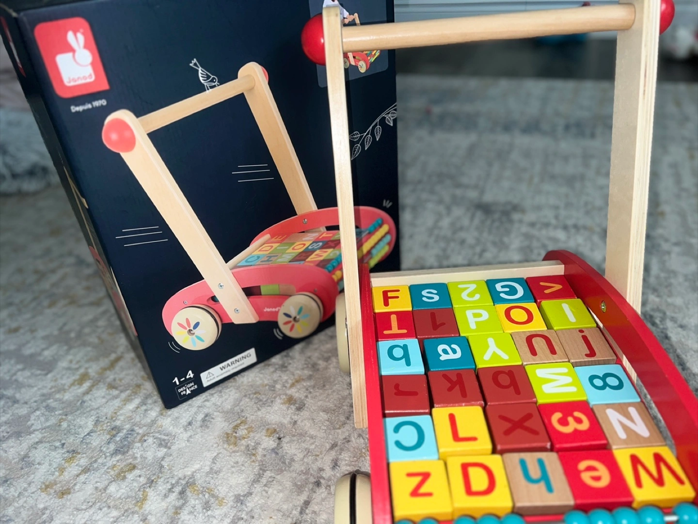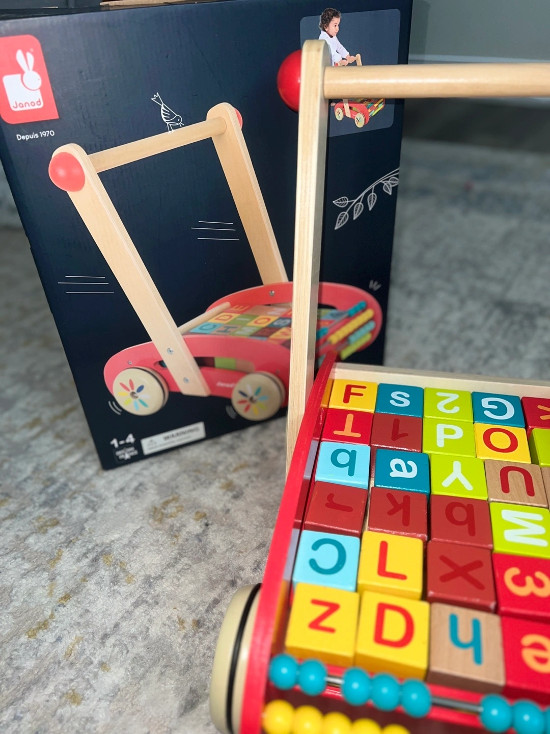 This Janod baby walker is perfect for little ones learning to walk! It comes with a set of colourful alphabet blocks for added fun and learning. The walker is in great condition and ready for a new home. The original price was $159.99 and it comes with the box! Recommended for ages 1-4
