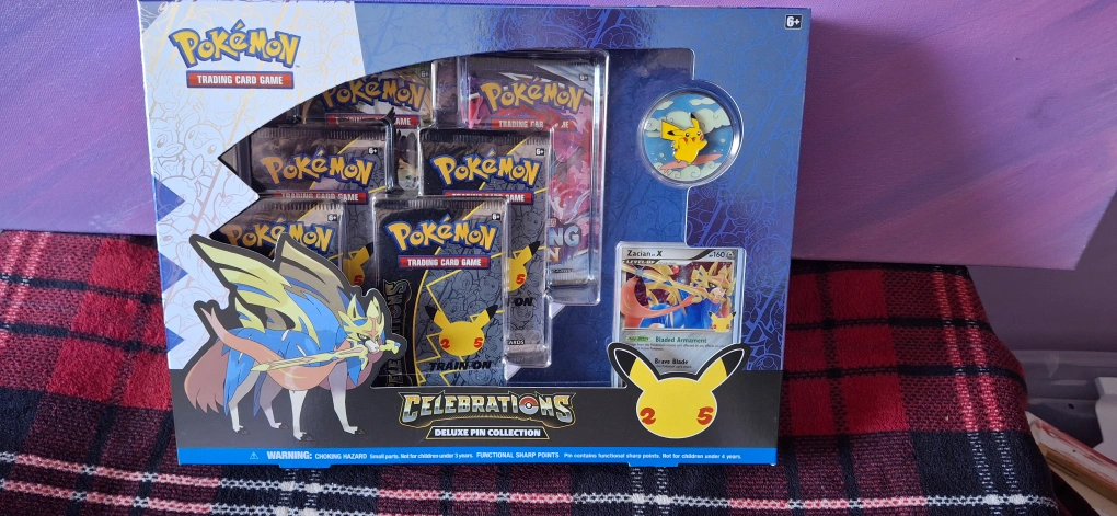 Selling a Pokémon TCG Celebrations Deluxe Pin Collection! This set celebrates Pokémon's 25th anniversary with cards and accessories featuring Zacian LV.X.
