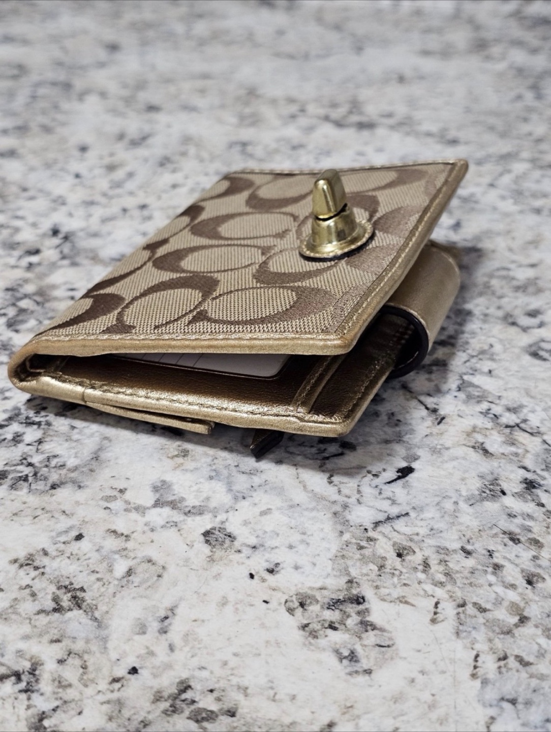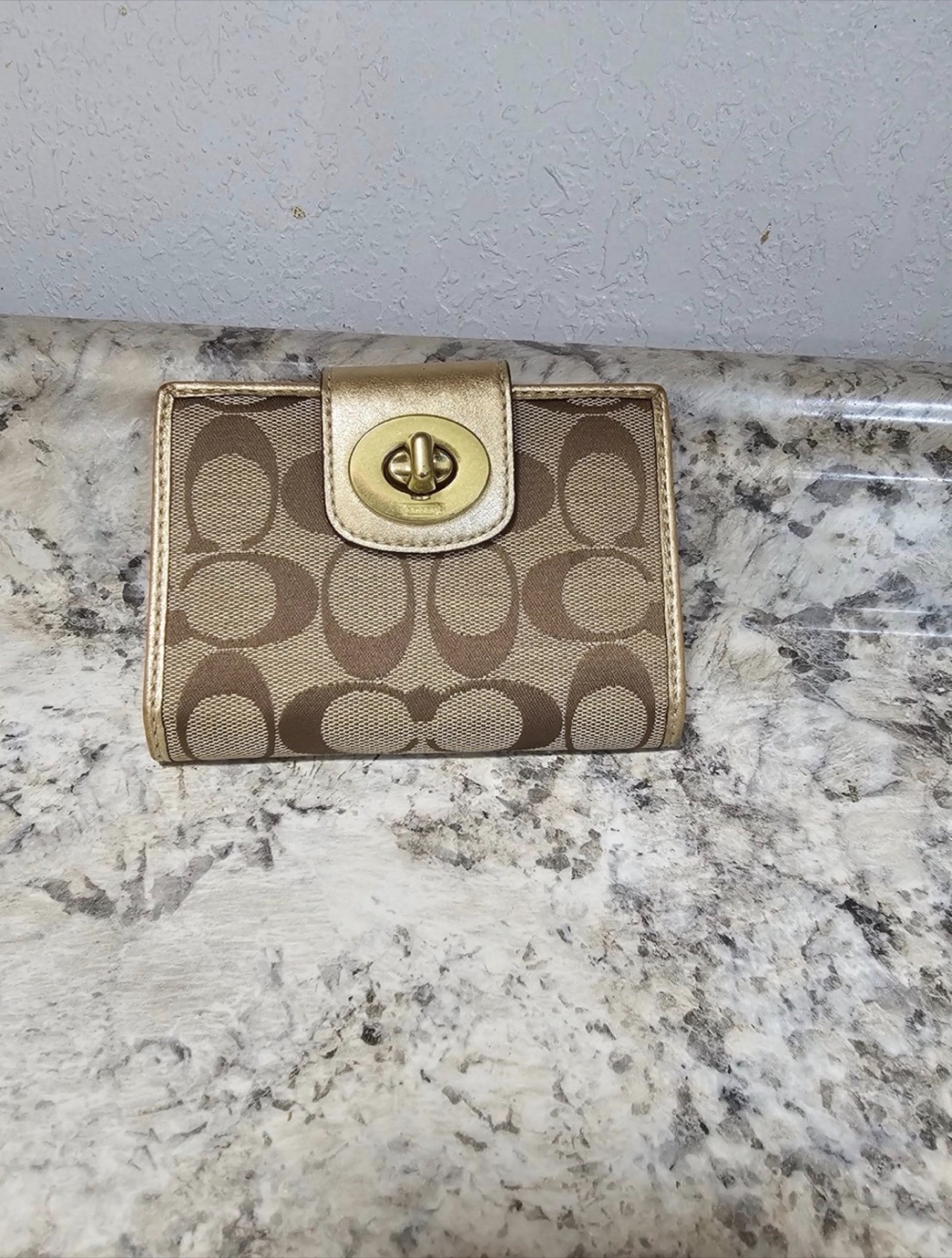 Selling a Coach wallet with the signature Coach print and a gold turnlock closure. It's in good condition and has plenty of slots for cards and cash. The interior is a matching gold color. Perfect for everyday use!