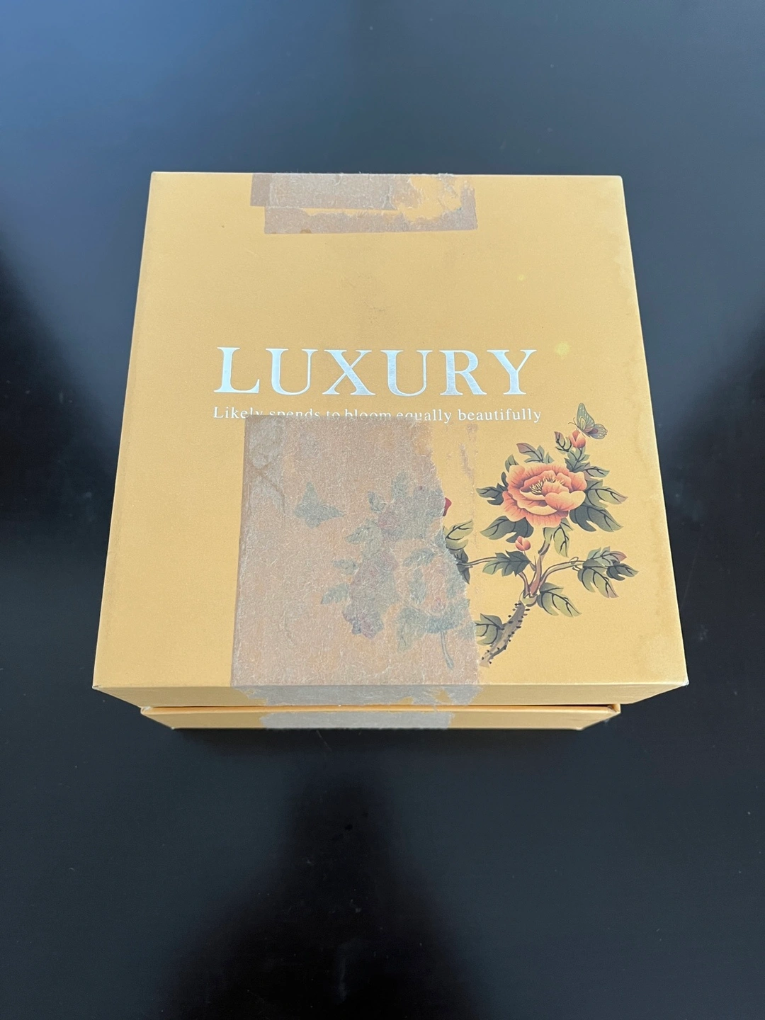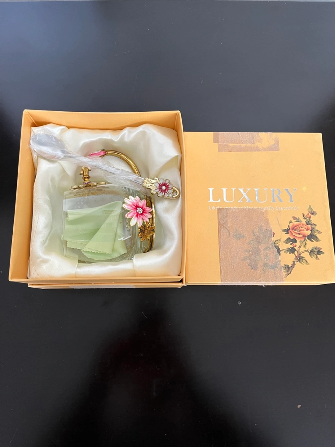 This is a beautiful glass mug with a flower design and a matching spoon. It comes in its original box with satin lining, making it a lovely gift or a special treat for yourself.