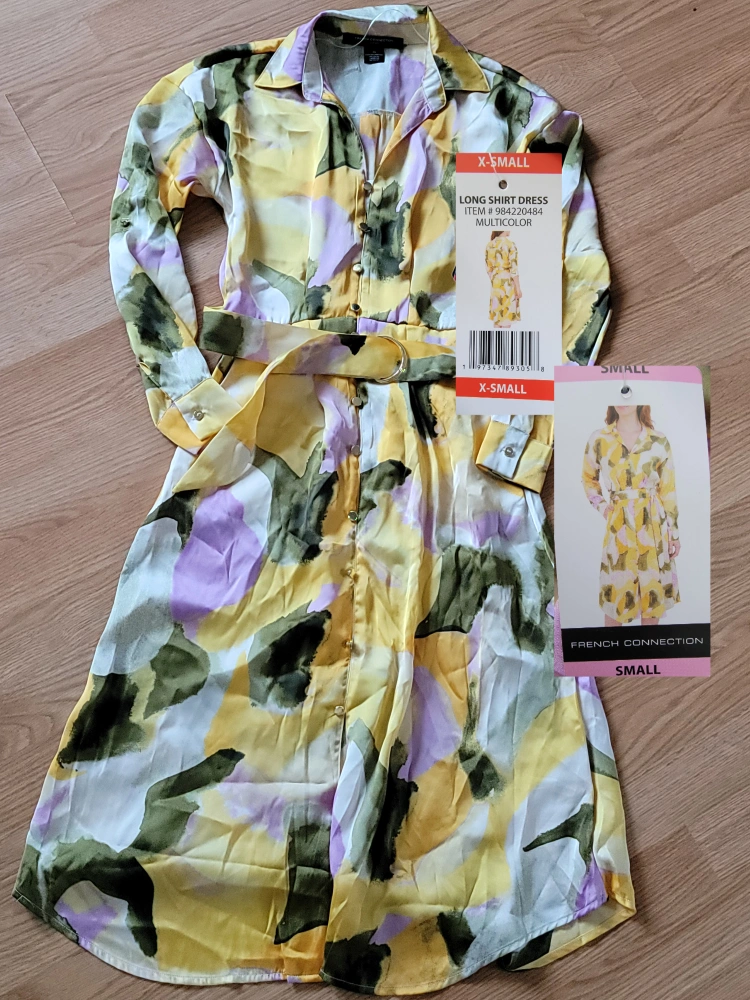 Selling a French Connection long shirt. It's a beautiful multicolour dress! The dress features a button-down front and a matching belt to cinch the waist. It's made from a lightweight material.