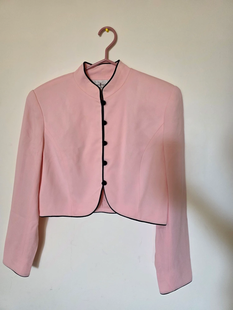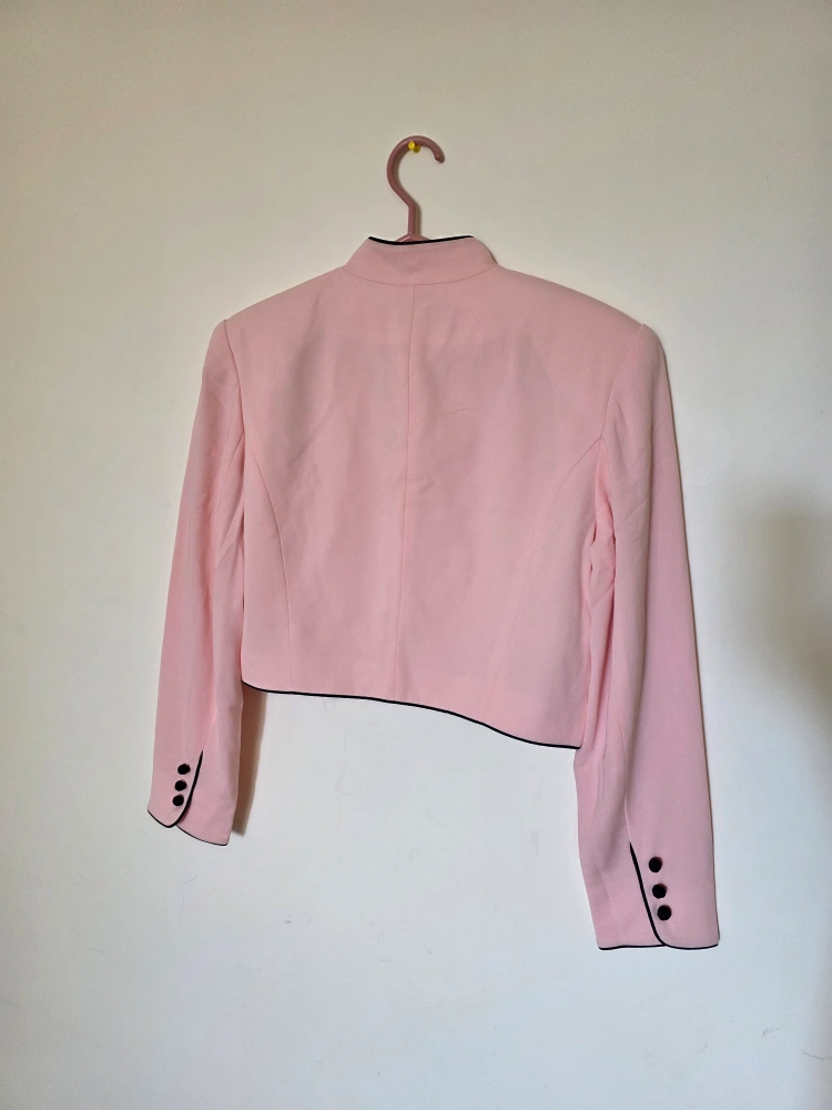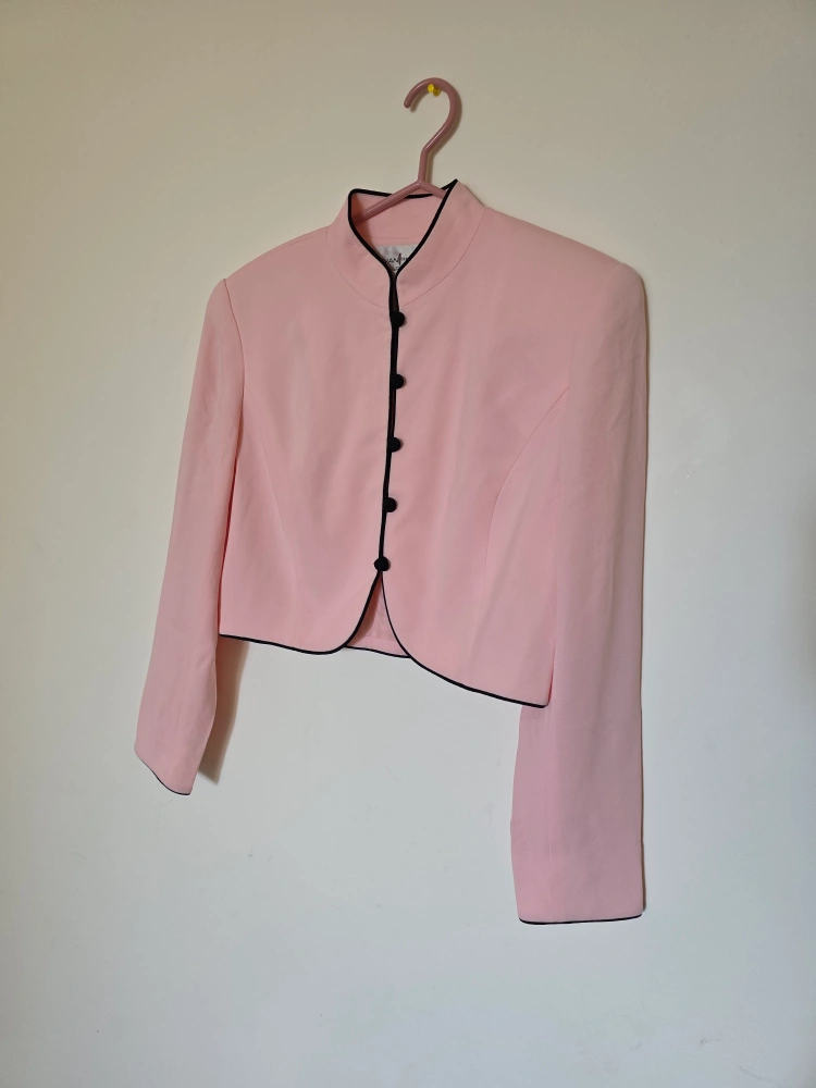 Here's a super cute Evan-Picone cropped jacket in a lovely pink colour with black trim. It's a size 8 and still has the original tag attached!