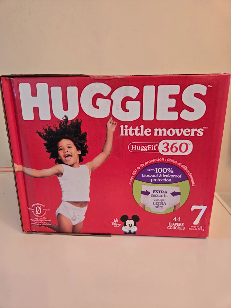 Selling a box of Huggies Little Movers diapers, size 7. These diapers feature HuggFit 360° for a secure and comfortable fit. The box contains 44 diapers, suitable for babies over 41 lbs or 19 kg. They offer up to 100% blowout and leakproof protection, giving you peace of mind