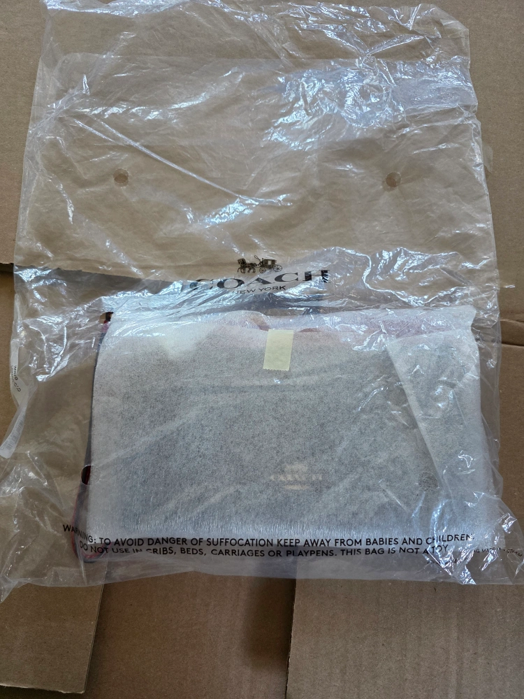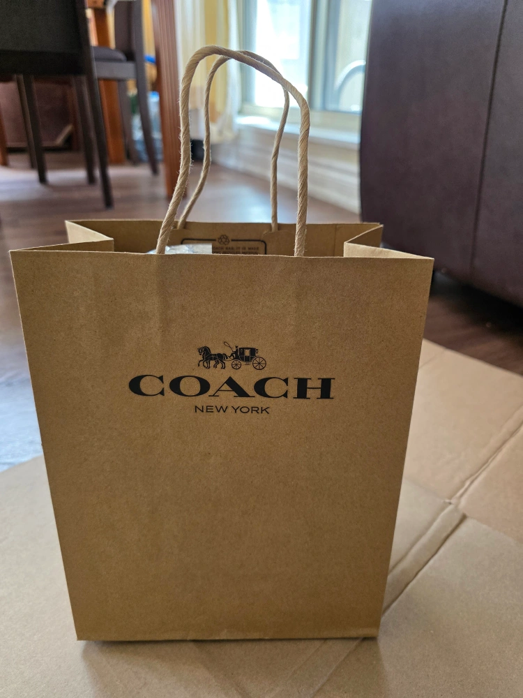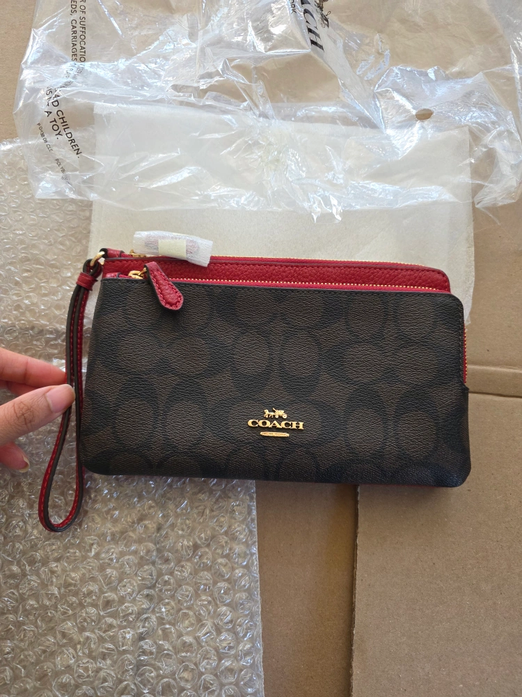 I'm selling a brand new Coach wristlet wallet in mediumish large size! It's a stylish brown and red colour and comes with the original packaging. Perfect for keeping your essentials organized on the go. The wristlet has a convenient wrist strap and multiple compartments inside. Comes with a paper gift bag.