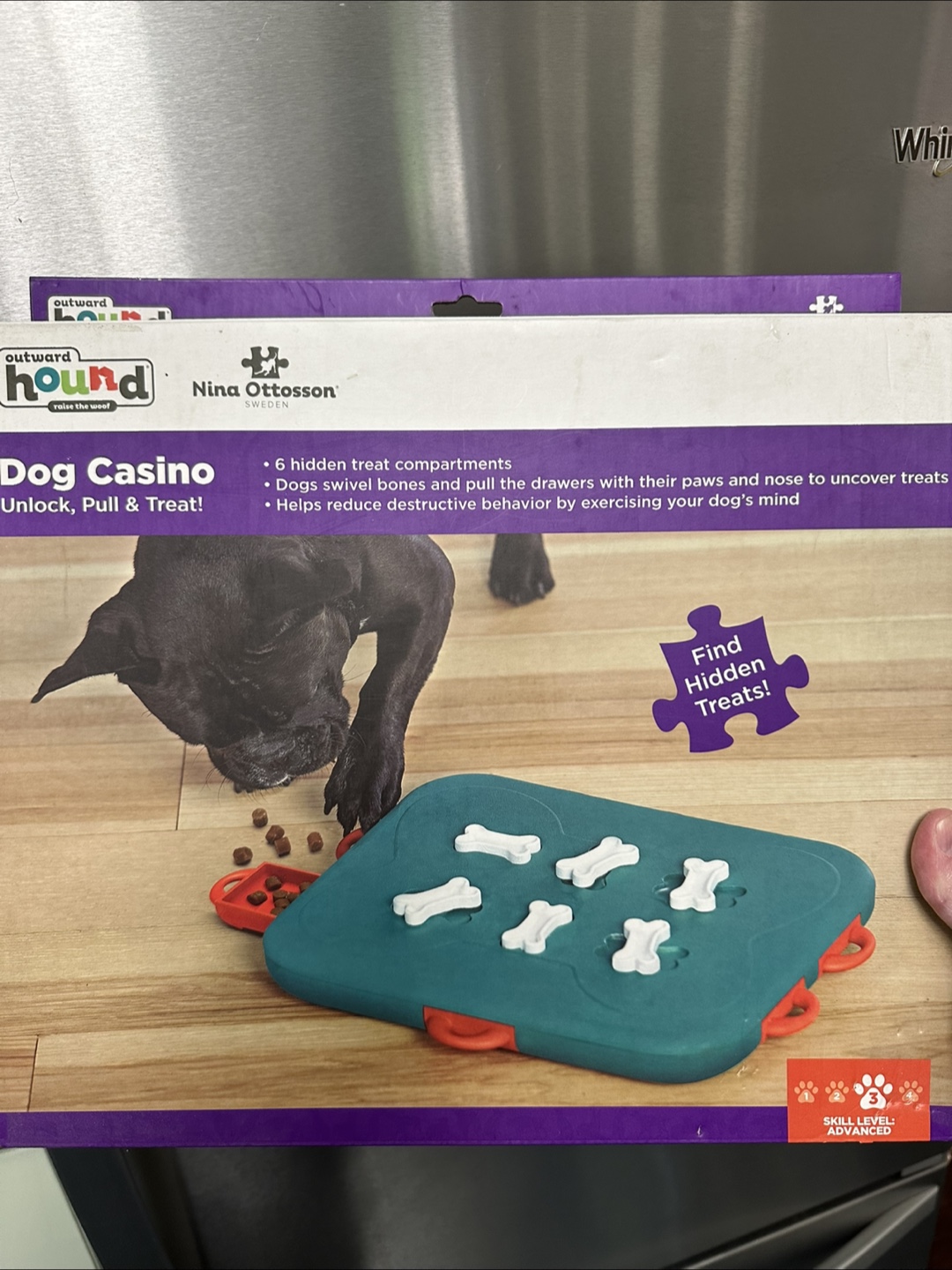 Selling a Nina Ottosson Dog Casino puzzle by Outward Hound! This interactive game has six hidden treat compartments to challenge your furry friend. Dogs swivel bones and pull the drawers with their paws and nose to uncover treats. It also helps reduce destructive behaviour by exercising your dog's mind.