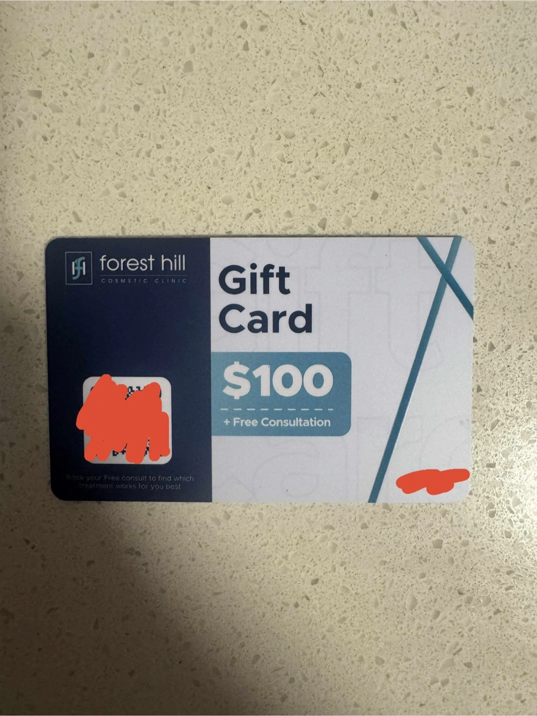 Forest Hill Cosmetic Clinic gift card valued at $100. It also includes a free consultation! This card can be applied to any treatment at our clinic and can only be availed once and can't be combined with another offer. Minimum $1,000 purchase for Botox and Fillers