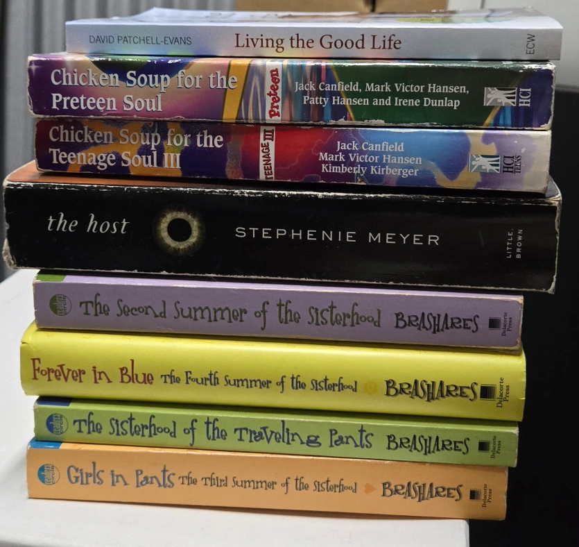 Selling a stack of books including: - Living the Good Life by David Patchell-Evans - Chicken Soup for the Preteen Soul by Jack Canfield, Mark Victor Hansen, Patty Hansen and Irene Dunlap - Chicken Soup for the Teenage Soul III by Jack Canfield, Mark Victor Hansen, Kimberly Kirberger - The Host by Stephenie Meyer - The Second Summer of the Sisterhood BRASHARES - Forever In Blue The Fourth Summer of the Sisterhood BRASHARES - The Sisterhood of the Traveling Pants BRASHARES - Girls in Pants The Third Summer of the Sisterhood BRASHARES