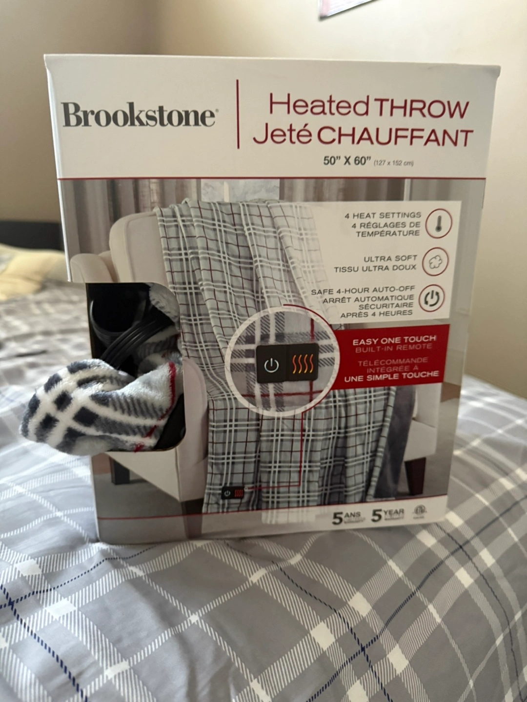 Snuggle up with this cozy Brookstone heated throw! It's brand new in the box and ready to keep you warm all winter long.
