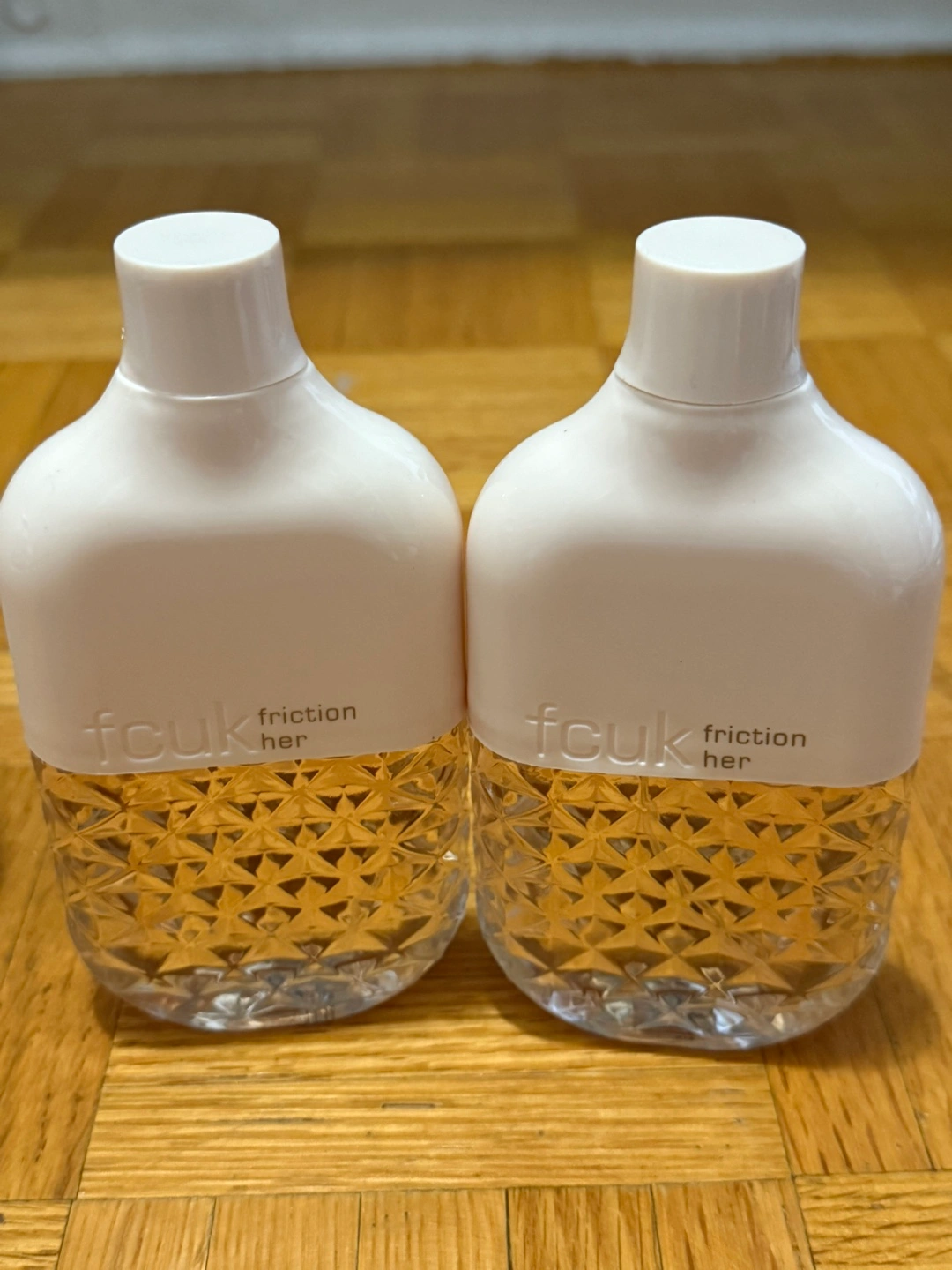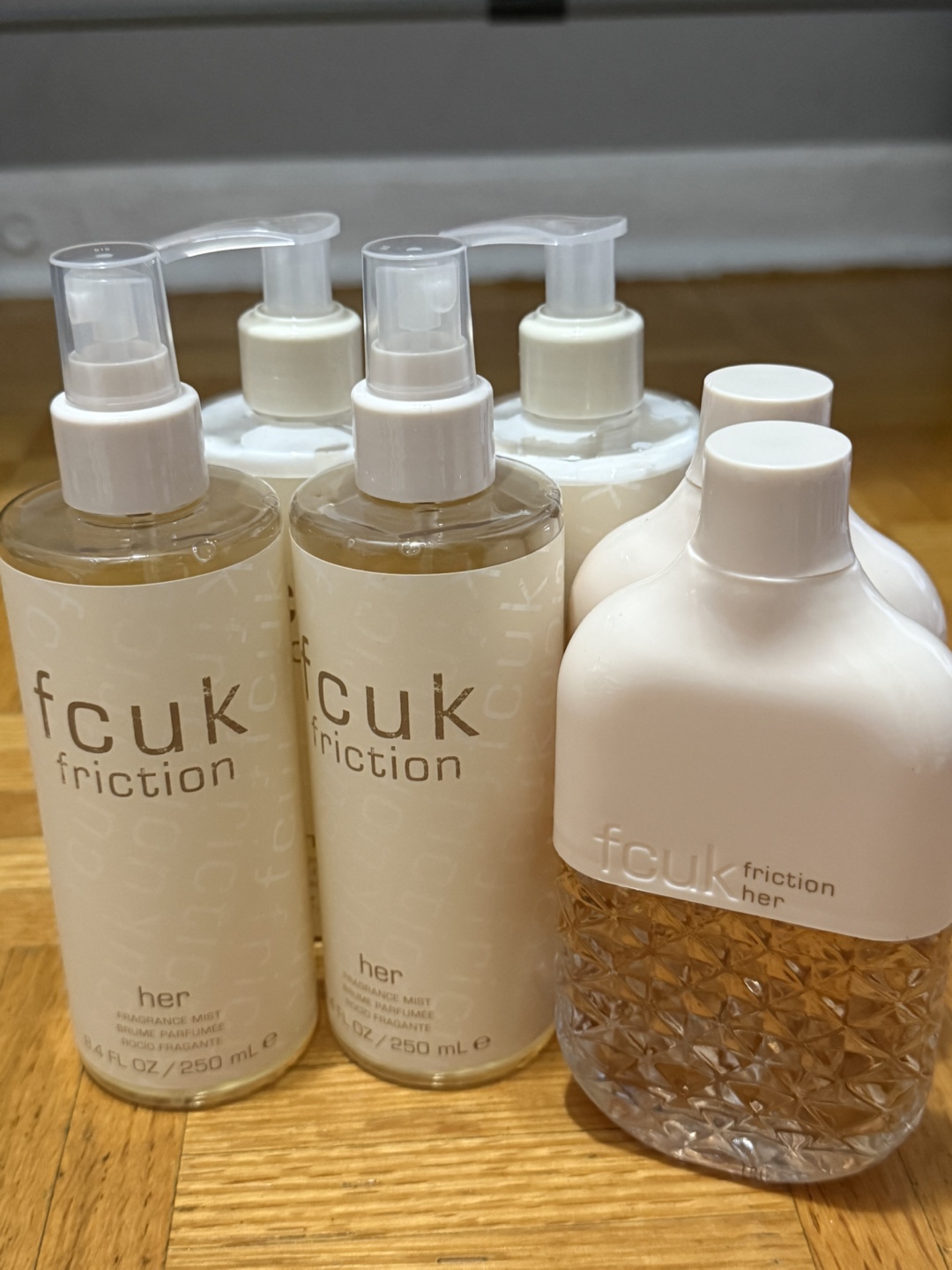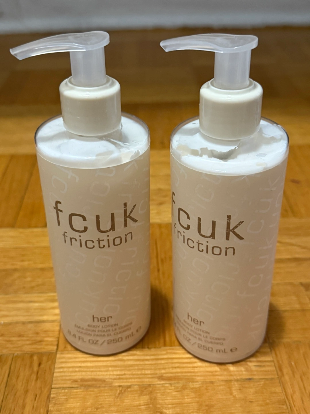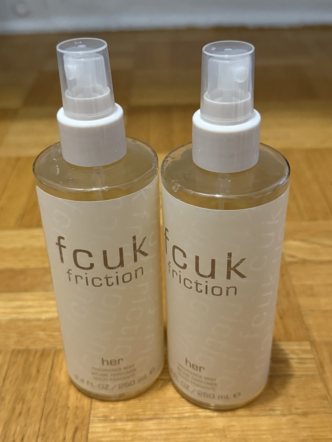 Selling a set of FCUK Friction Her body lotion and fragrance mist. Each bottle contains 8.4 fl oz / 250 ml. Perfect for layering the scent or using them individually
