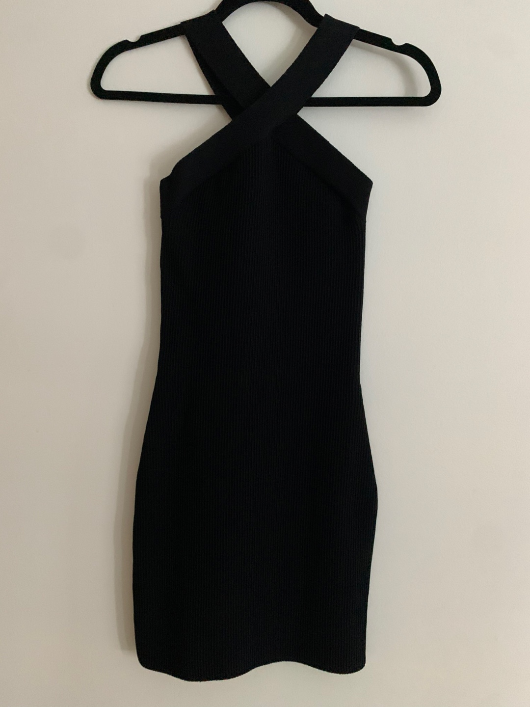 This is a cute Babaton mini dress in black. It features a criss-cross halter neckline and a bodycon fit. It's made of a comfortable ribbed material and is a size XS. Perfect for a night out!
