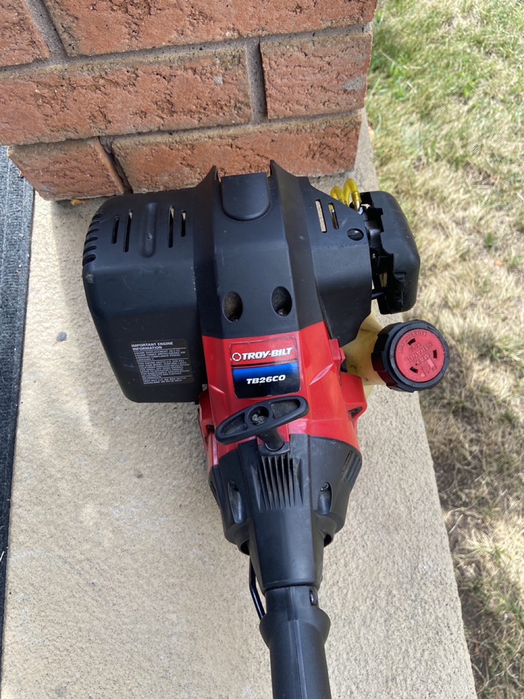 Troy-Bilt TB26CO gas-powered string trimmer. Giving it away for free. Needs carburetor serviced or replaced. Has no spool head as per last picture -FREE. - will leave on porch. For pick up