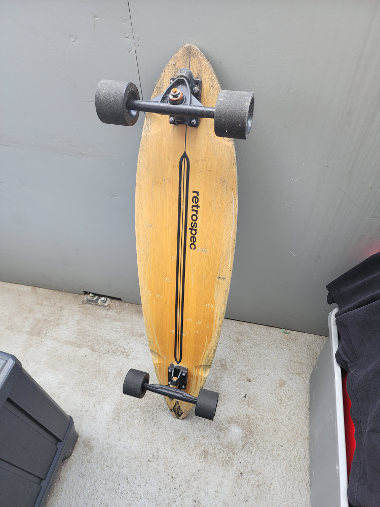 Selling a Retrospec Zed longboard skateboard. It's in good condition and ready to ride! Great for cruising around town or campus. It has a cool retro look with the Retrospec logo on the bottom.