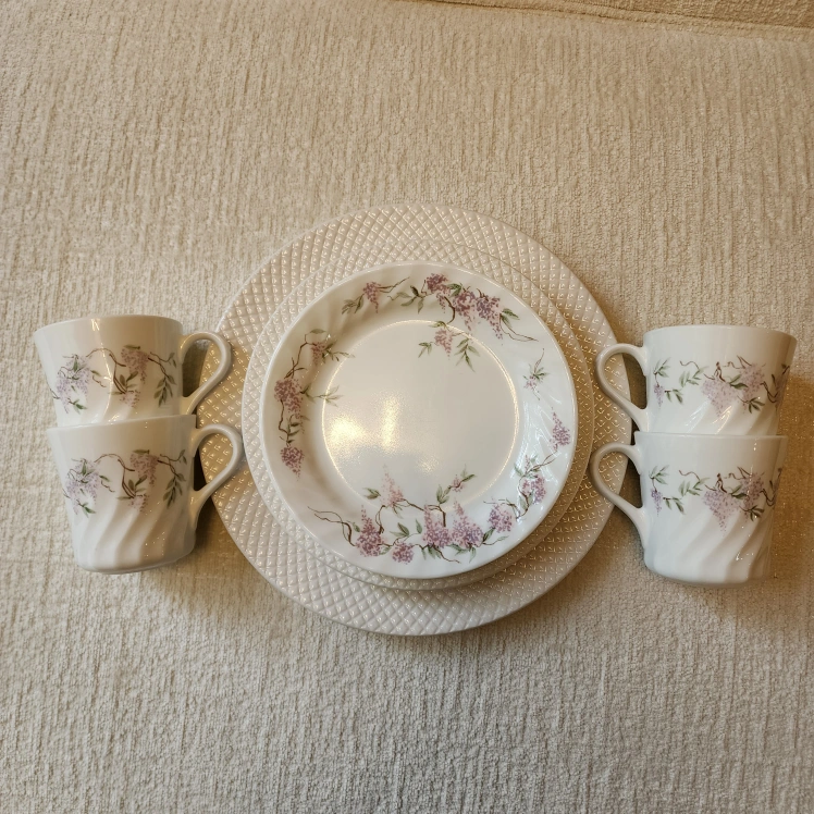 Selling a lovely vintage dinnerware set featuring a delicate lilac floral design. Includes plates and mugs. Perfect for adding a touch of elegance to your table!