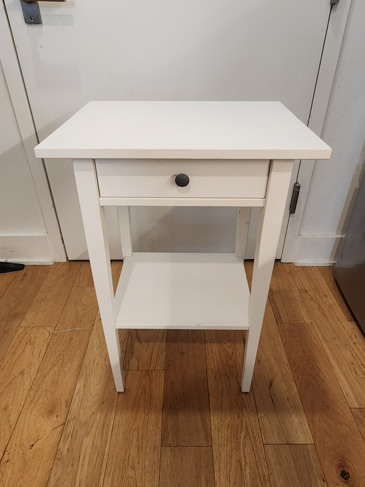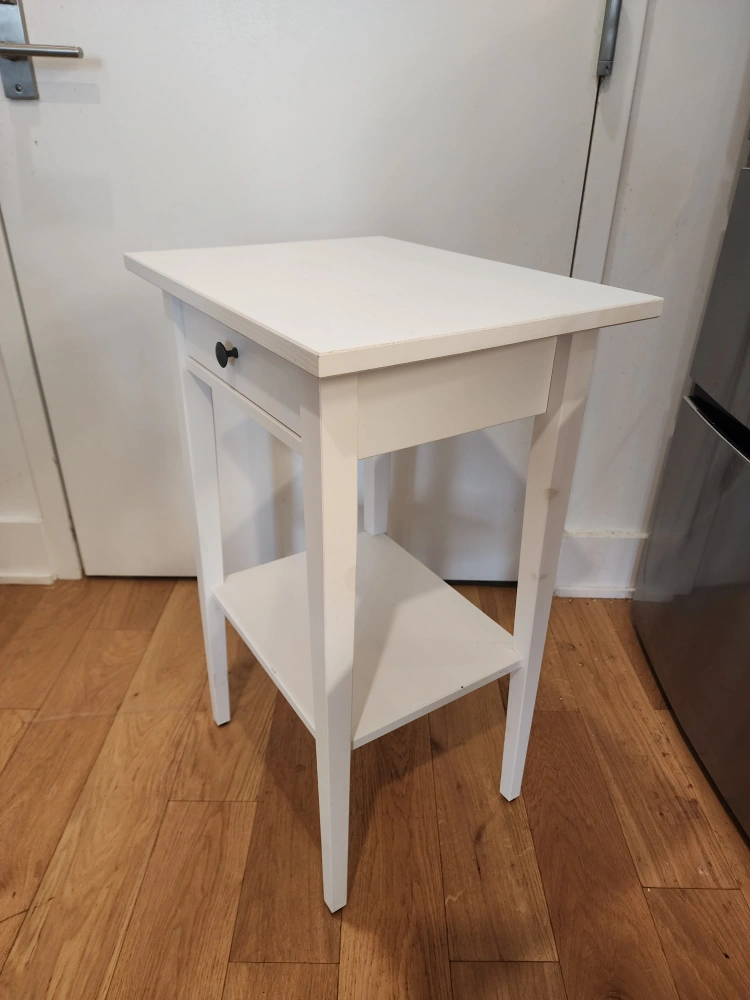 Selling a cute IKEA bedside table. It's white and has a drawer and a shelf underneath for extra storage. Perfect for a small space!