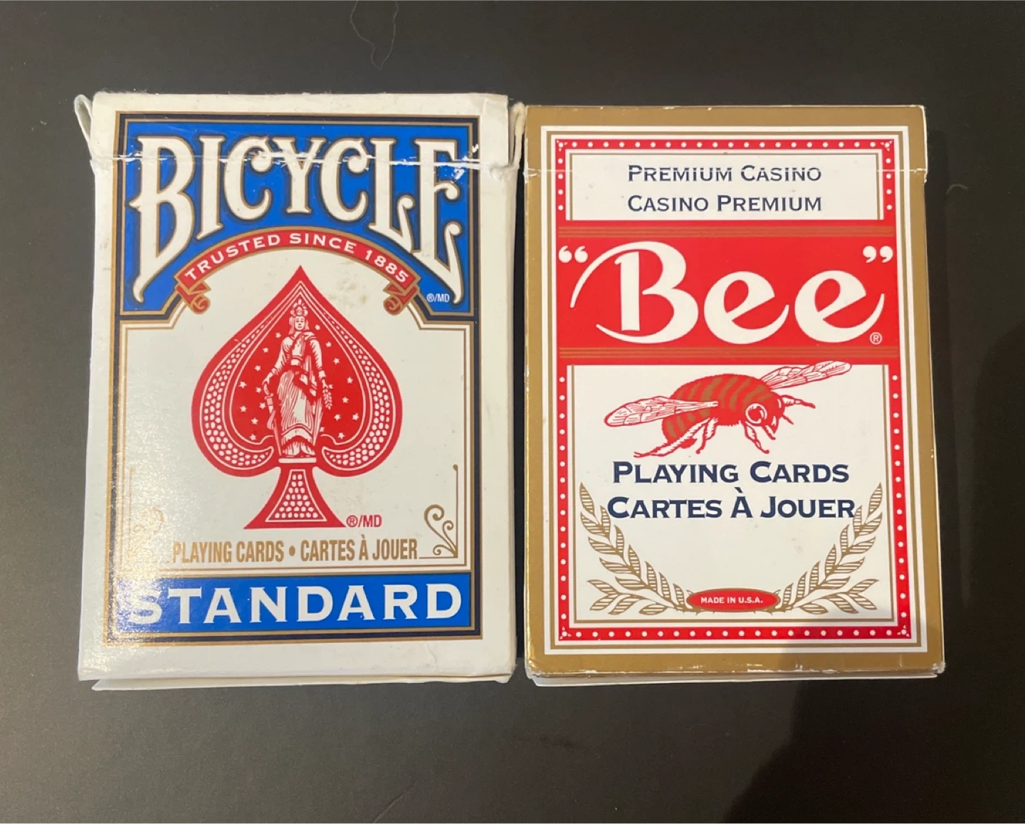 Free Two decks of playing cards. One is a Bicycle Standard deck, and the other is a Bee Premium Casino deck. Both decks are complete and ready for your next card game night!
