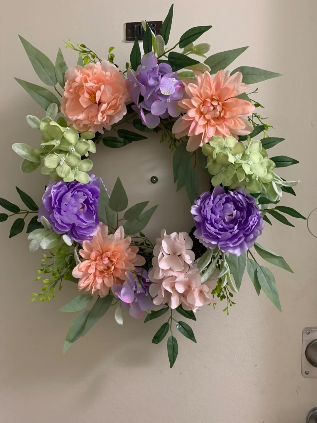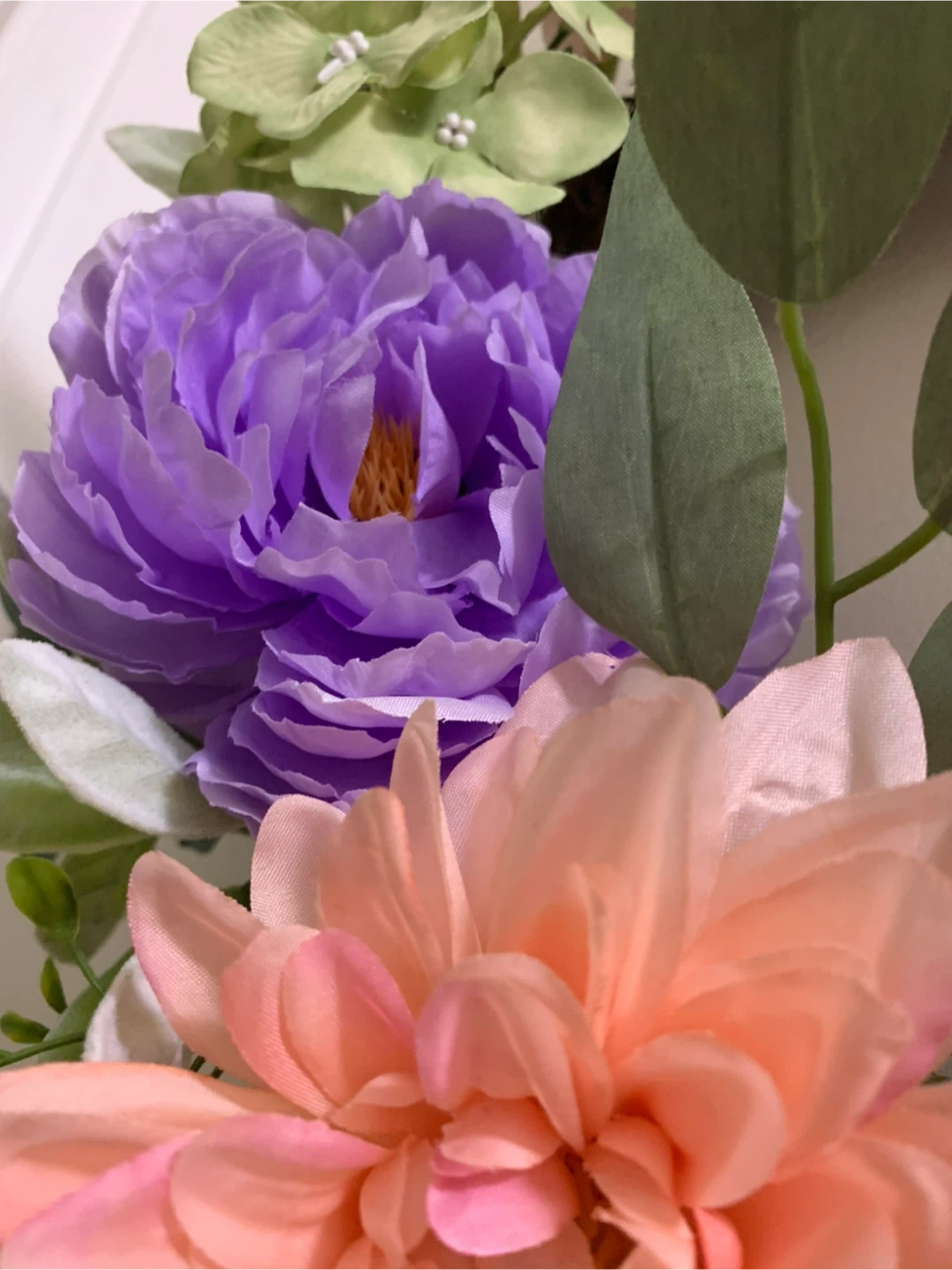 This beautiful floral wreath features a lovely combination of purple, peach, and green flowers and leaves. It would be a great addition to any door or wall!