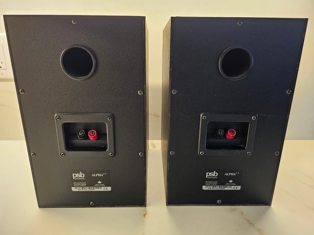 Selling a pair of PSB Alpha A/V speakers. They're in great condition and sound fantastic! Comes with speaker wires. Made in Canada. 13"H x 8"W x 10"D