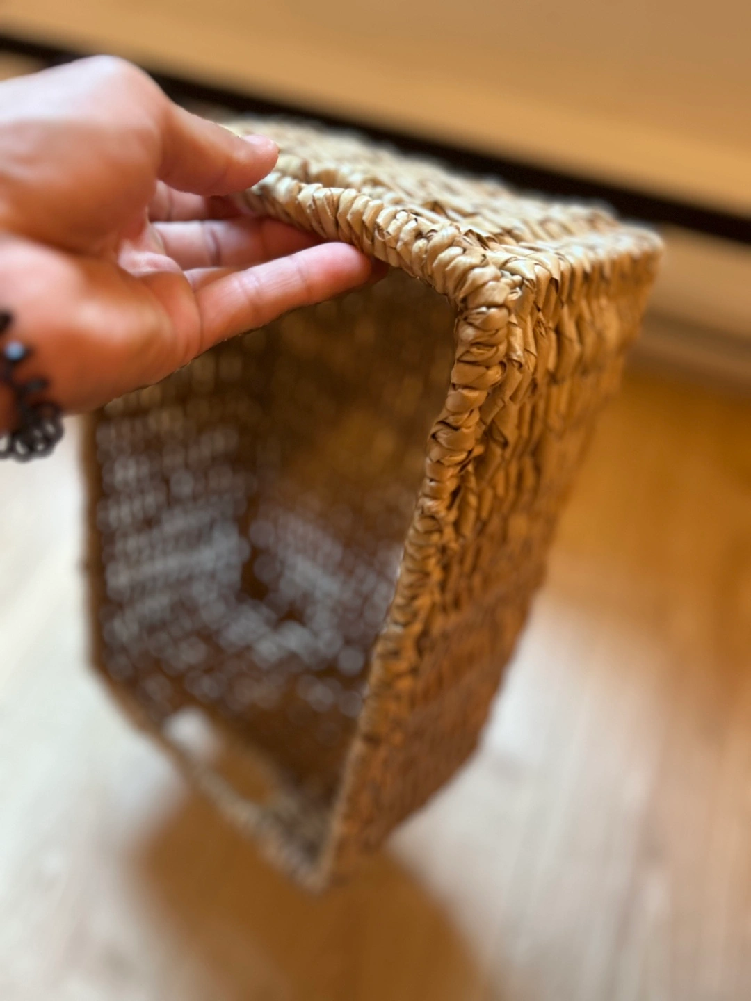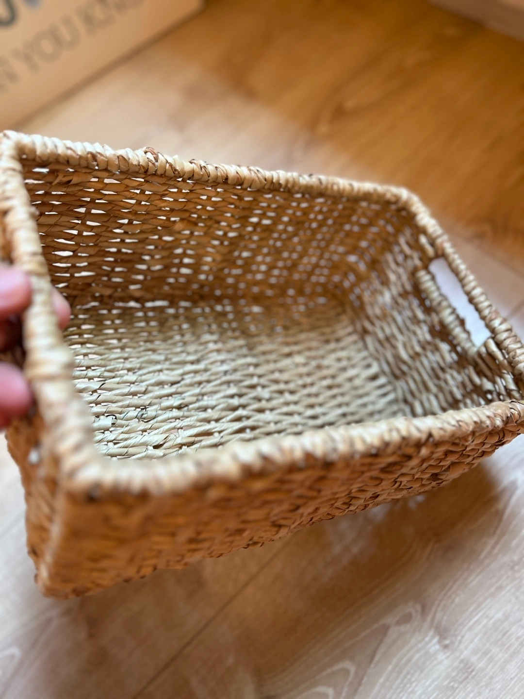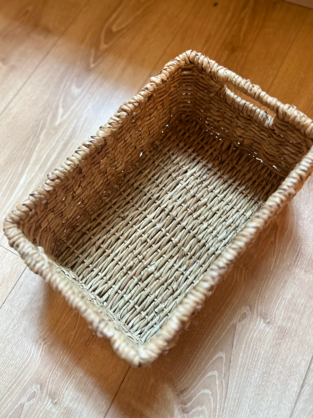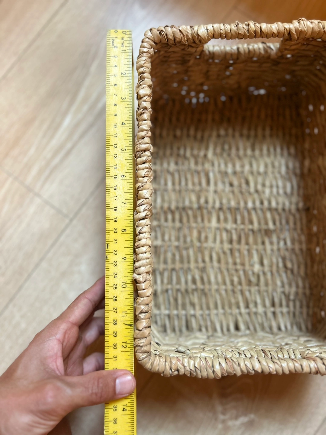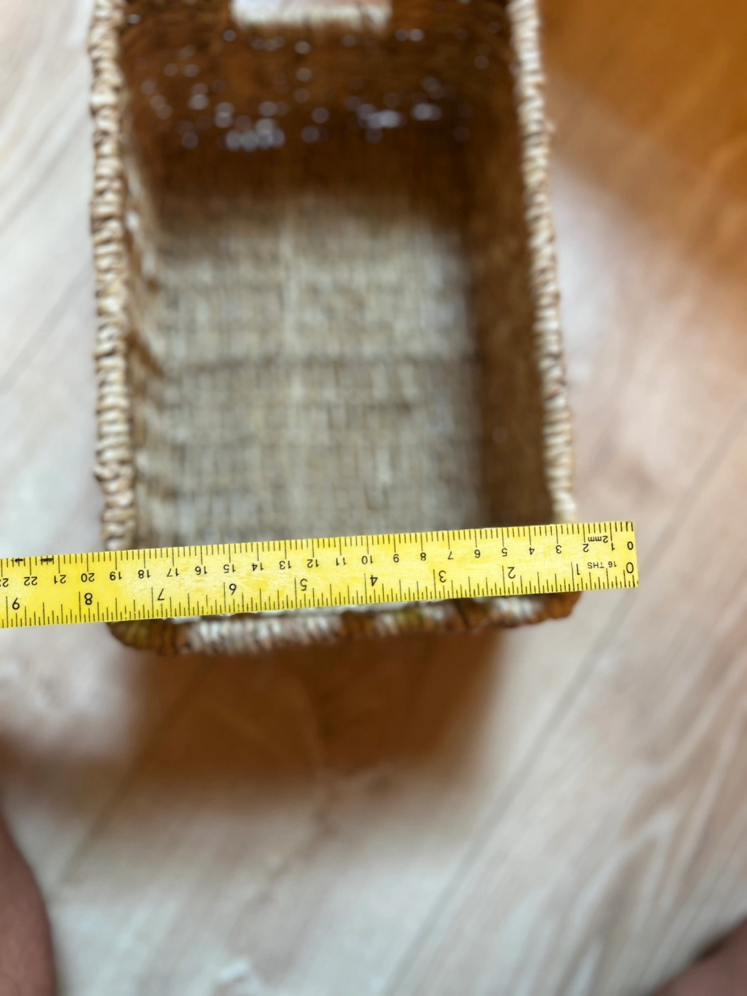 Selling a woven storage basket in great condition! It's perfect for organizing items around the house. The basket measures approximately 9 inches wide and 12 inches long. It's made of a natural, woven material.