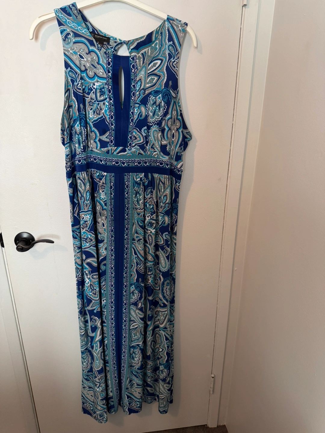 Selling an INC International Concepts maxi dress in size 2X. The dress features a beautiful blue paisley pattern. It's made from 95% polyester and 5% spandex for a comfortable fit