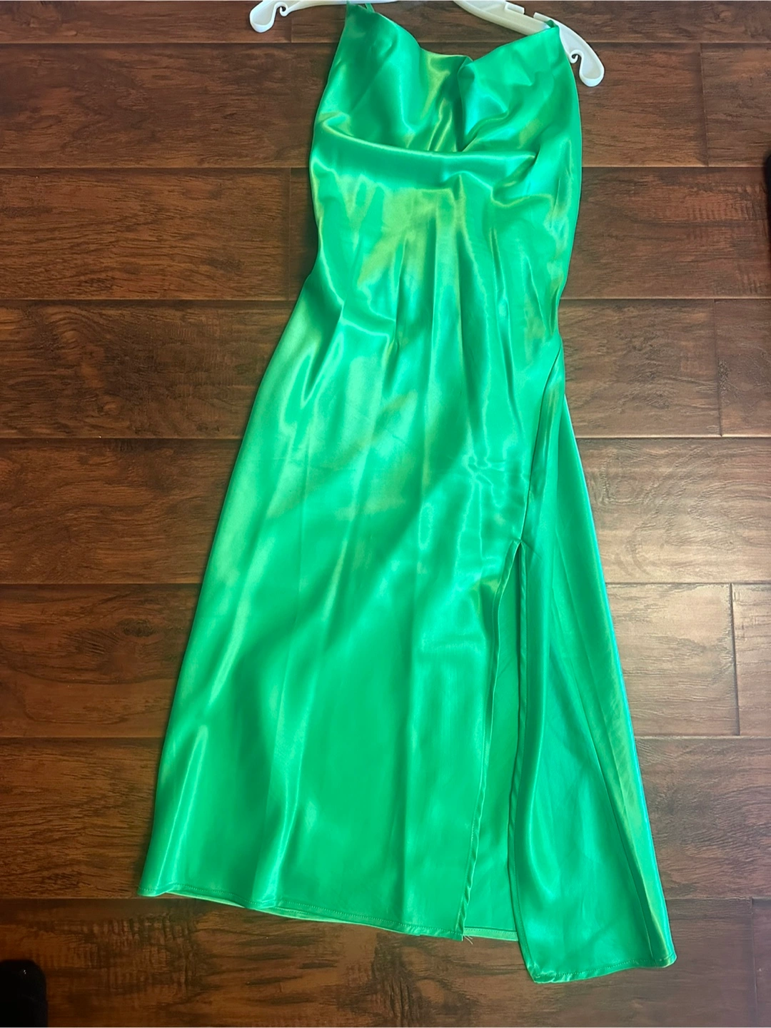 I'm selling a beautiful green satin dress! It features a flattering silhouette and a stylish side slit. Perfect for a night out or a special occasion