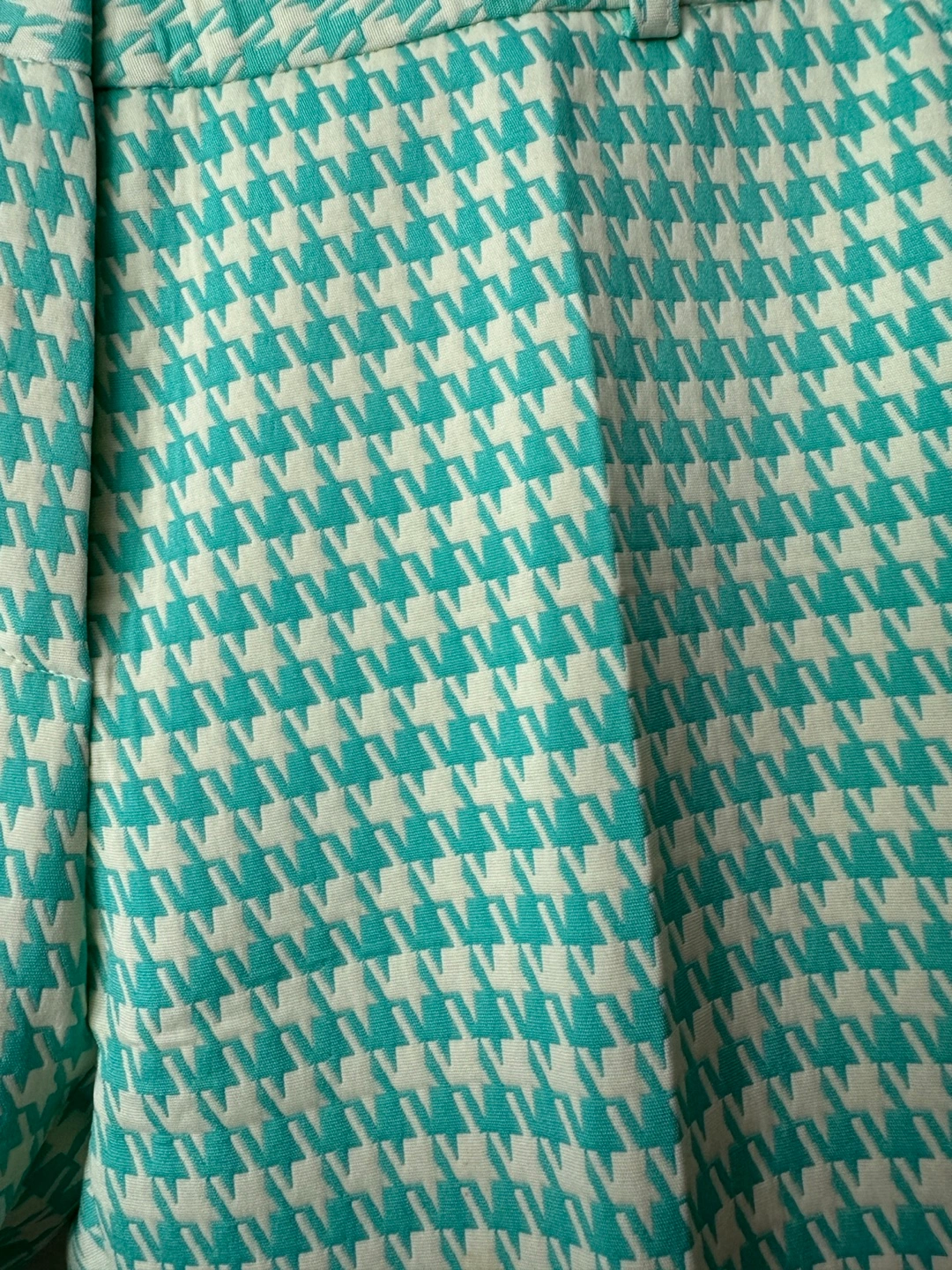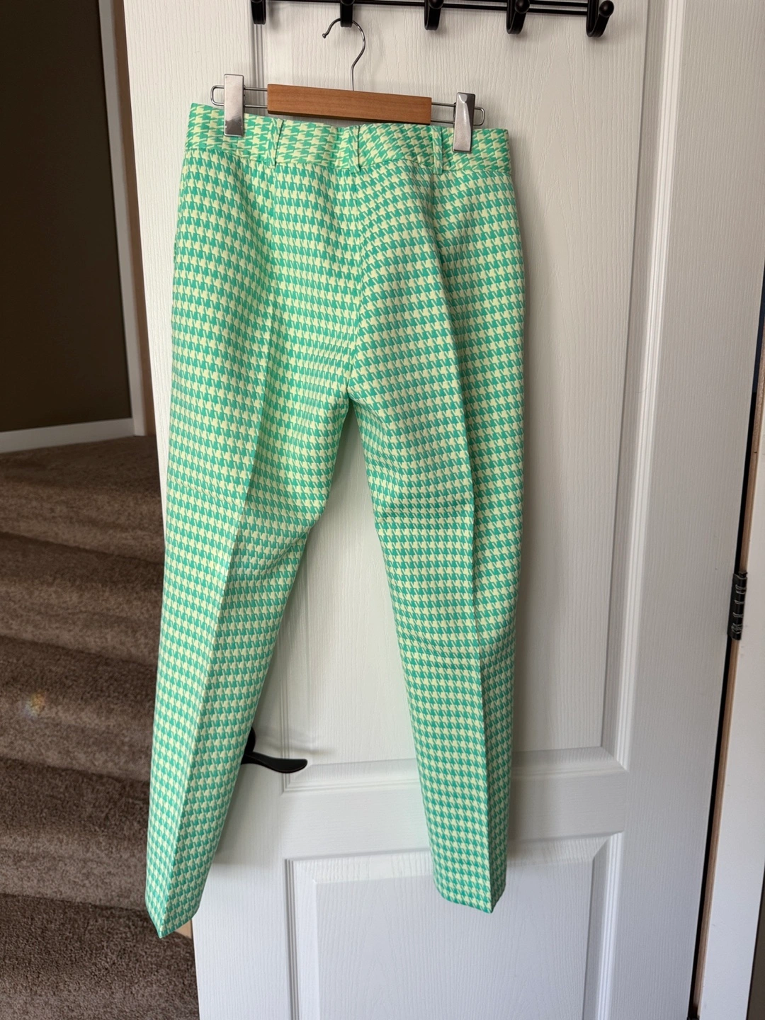 I'm selling these stylish pants with a fun houndstooth pattern. They're a refreshing green colour, perfect for adding a pop to your wardrobe. They are in great condition and ready for a new home!