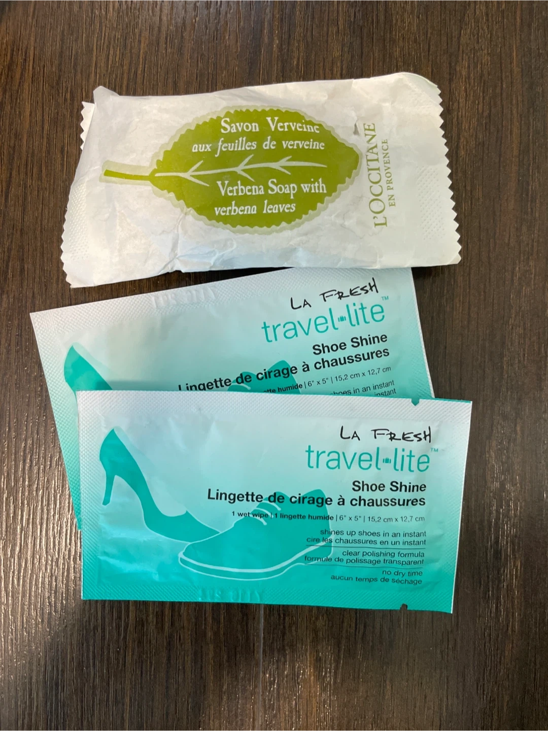I have a Verbena Soap from L'Occitane and LA Fresh Travel-Lite Shoe Shine wipes. The shoe shine wipes are perfect for a quick clean on the go! Each wipe is 6" x 5" (15.2 cm x 12.7 cm).