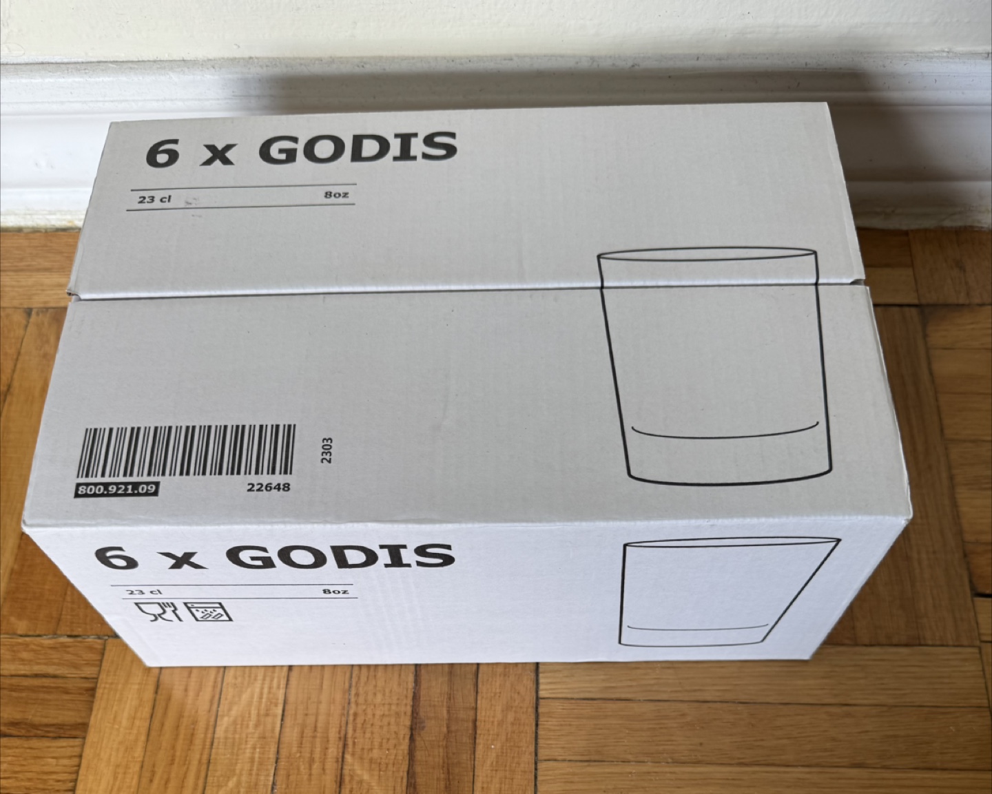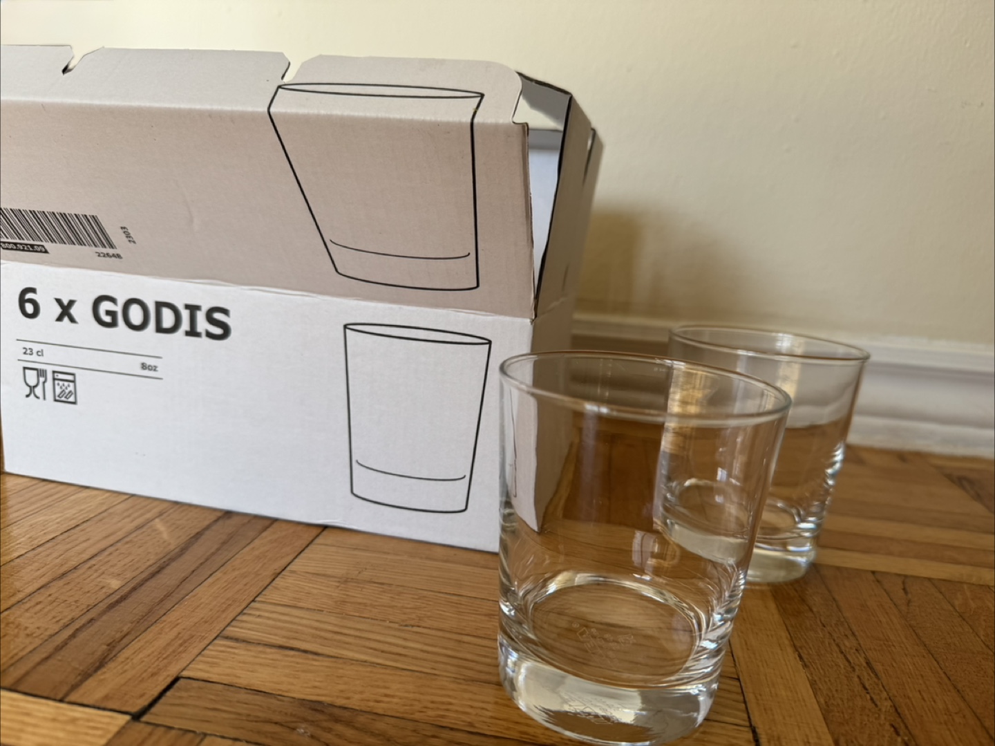 Selling a set of 6 IKEA GODIS glasses. They are 23 cl (8oz) each and come in their original box. Perfect for everyday use!